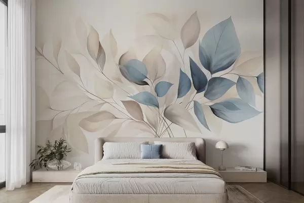 Stenske poslikave Abstraktni prosojni listi v odtenkih modre, bež in smetanove barve, teksturirana umetnost Št. w09744