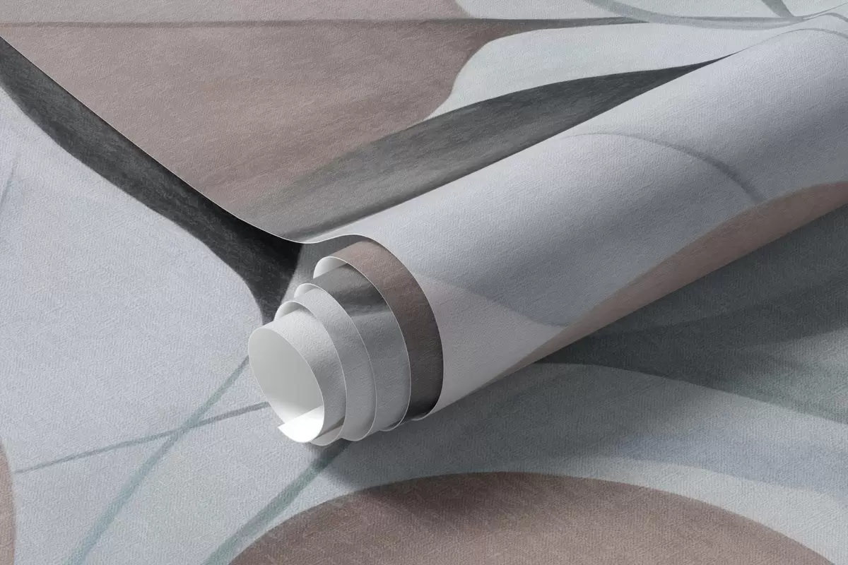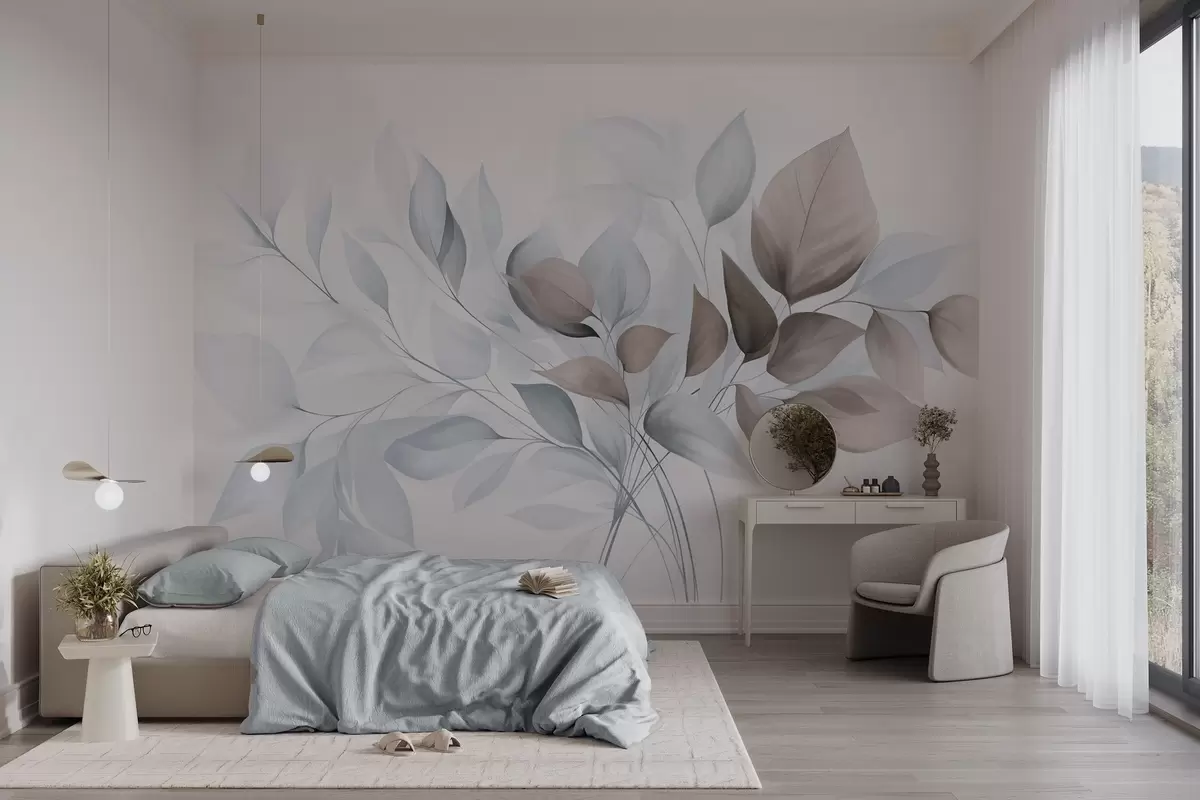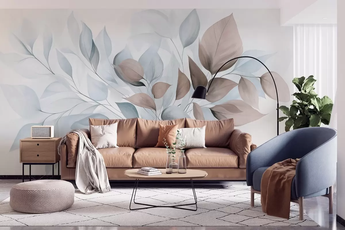 Stenske poslikave Abstraktni prosojni listi v odtenkih modre, bež in rjave barve, teksturirana umetnost Št. w09744v1