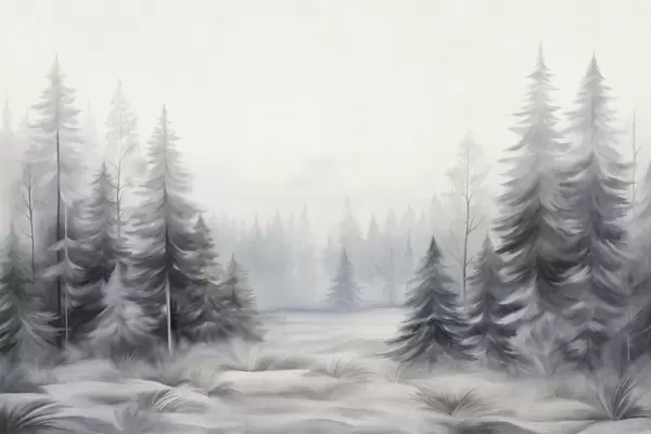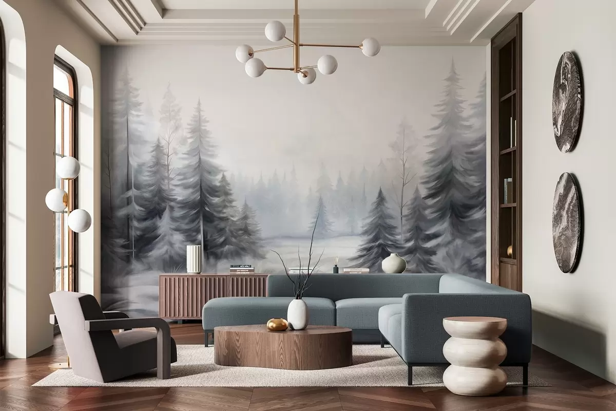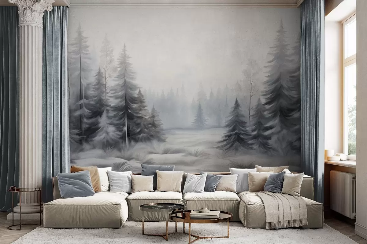 Stenske poslikave Teksturirana zimsko gozdna drevesa v megli, v pridušenih sivih in belih tonih Št. w09745