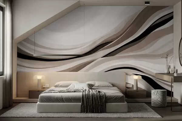 Stenske poslikave Abstraktne valovite črte v odtenkih bež in črne barve na svetlem ozadju, teksturirana umetnost Št. w09748