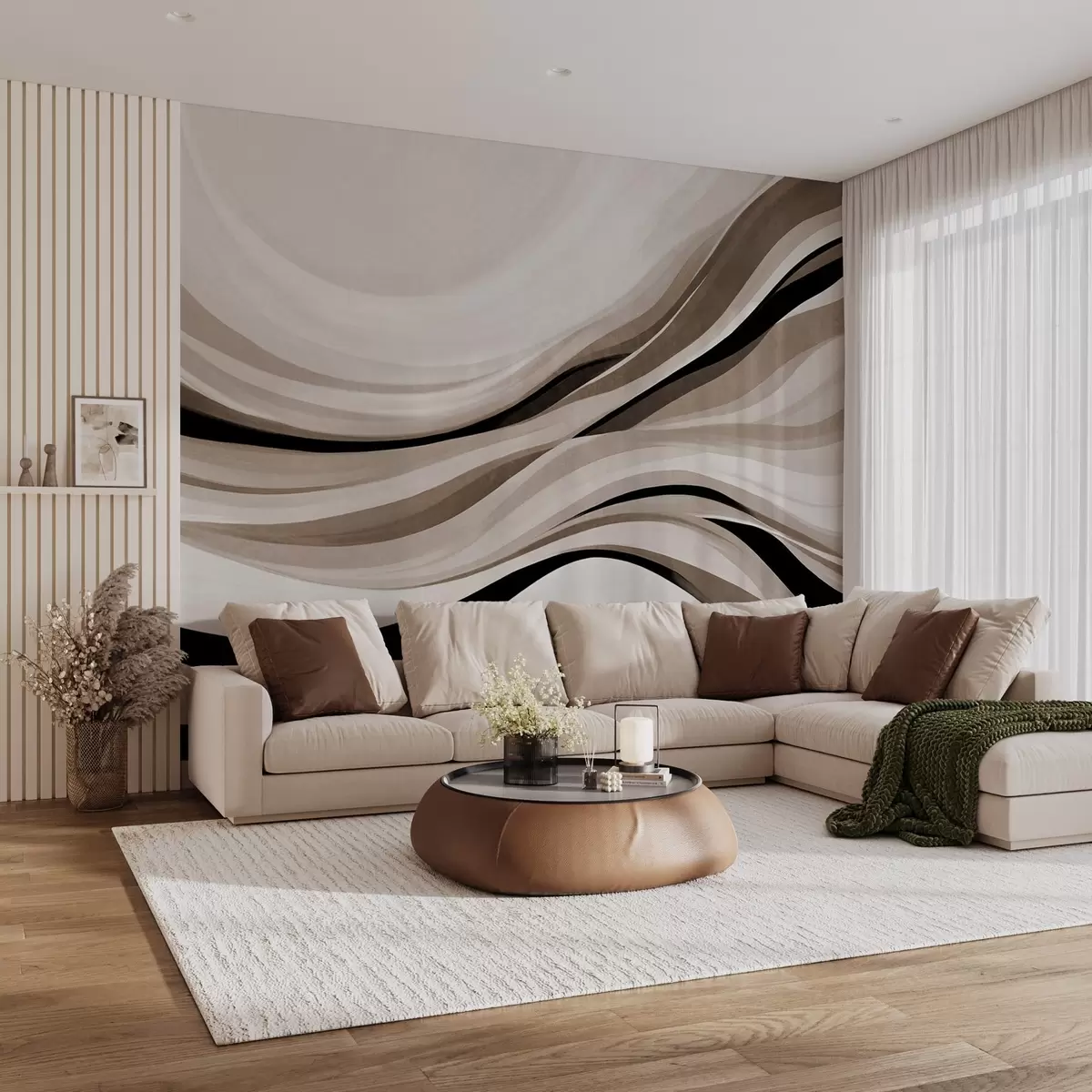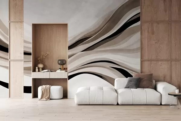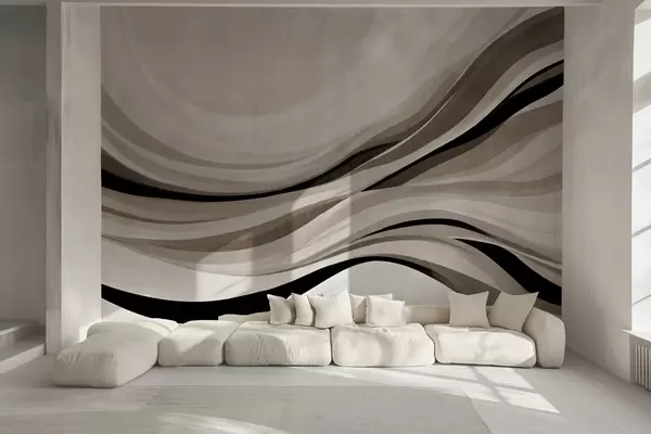 Stenske poslikave Abstraktne valovite črte v odtenkih bež in črne barve na svetlem ozadju, teksturirana umetnost Št. w09748