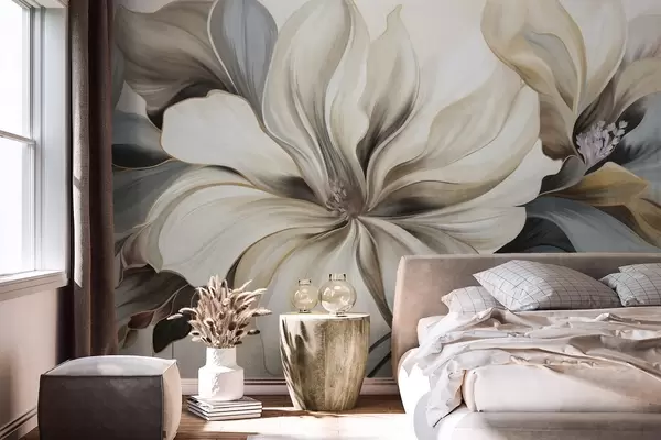 Stenske poslikave Veliki, kremasti cvetovi magnolije z rjavimi in sivimi listi, mehka osvetlitev, abstraktno ozadje Št. w09749