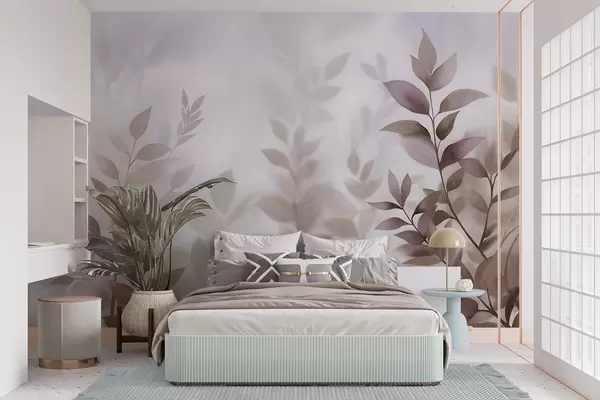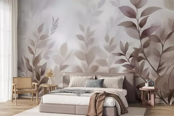 Stenske poslikave Nežne veje z bledimi rjavimi in bež listi, akvarelni slog slikanja, teksturirana umetnost Št. w09750