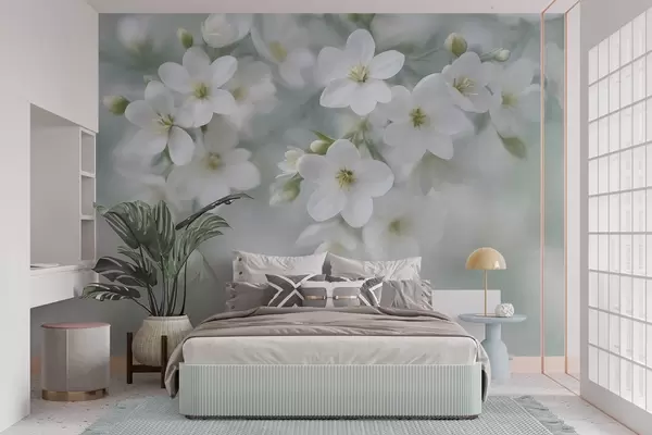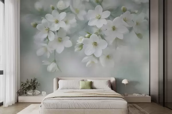 Stenske poslikave Nežni beli cvetovi z izrazito teksturo, ki se v ozadju nežno zabrisujejo Št. w09759