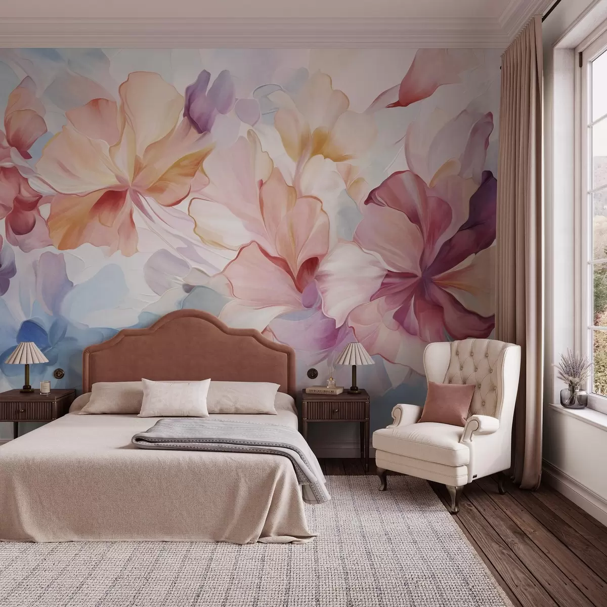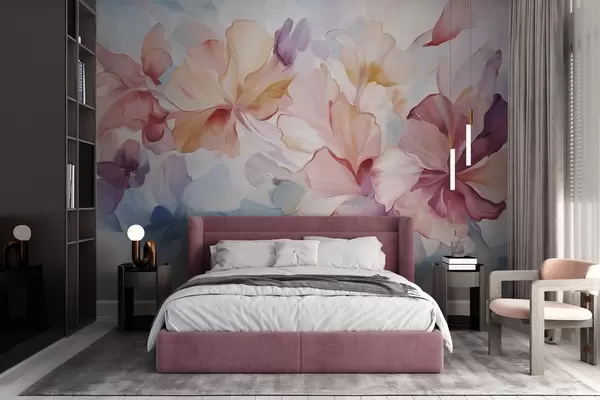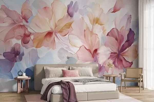Stenske poslikave Abstraktne fantazijske rože v odtenkih roza, breskve in sivke v slikarskem slogu, teksturirana umetnost Št. w09767