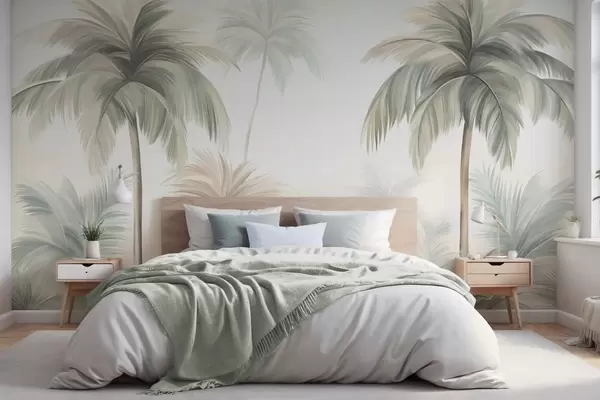 Stenske poslikave Drevesa s palmastimi listi v umirjenih zelenih in bež barvah pred nežnim nebom Št. w09770