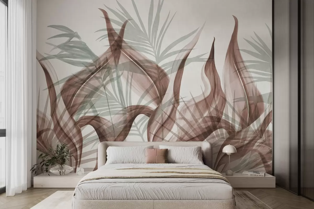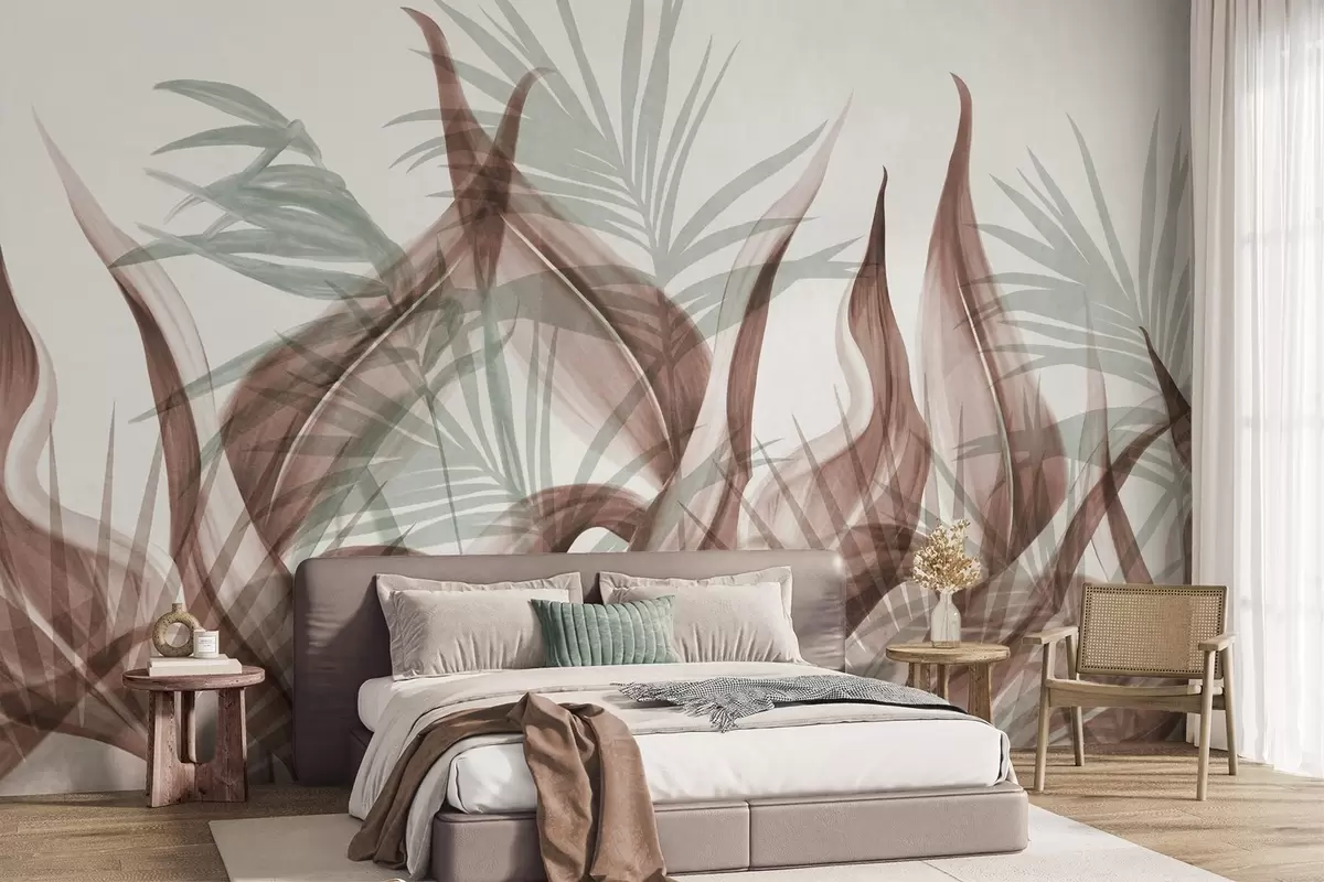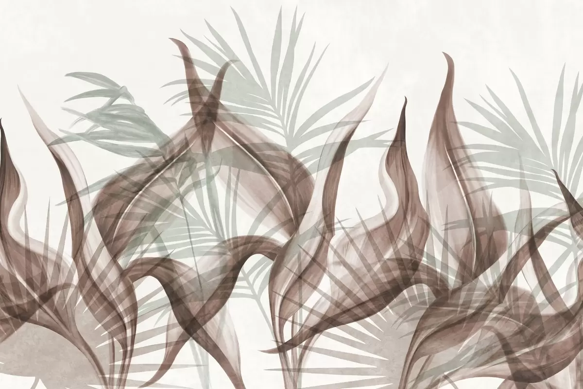 Stenske poslikave Tropski listi v odtenkih rjave in zelene barve na belem ozadju, teksturirani v akvarelnem slogu Št. w09772