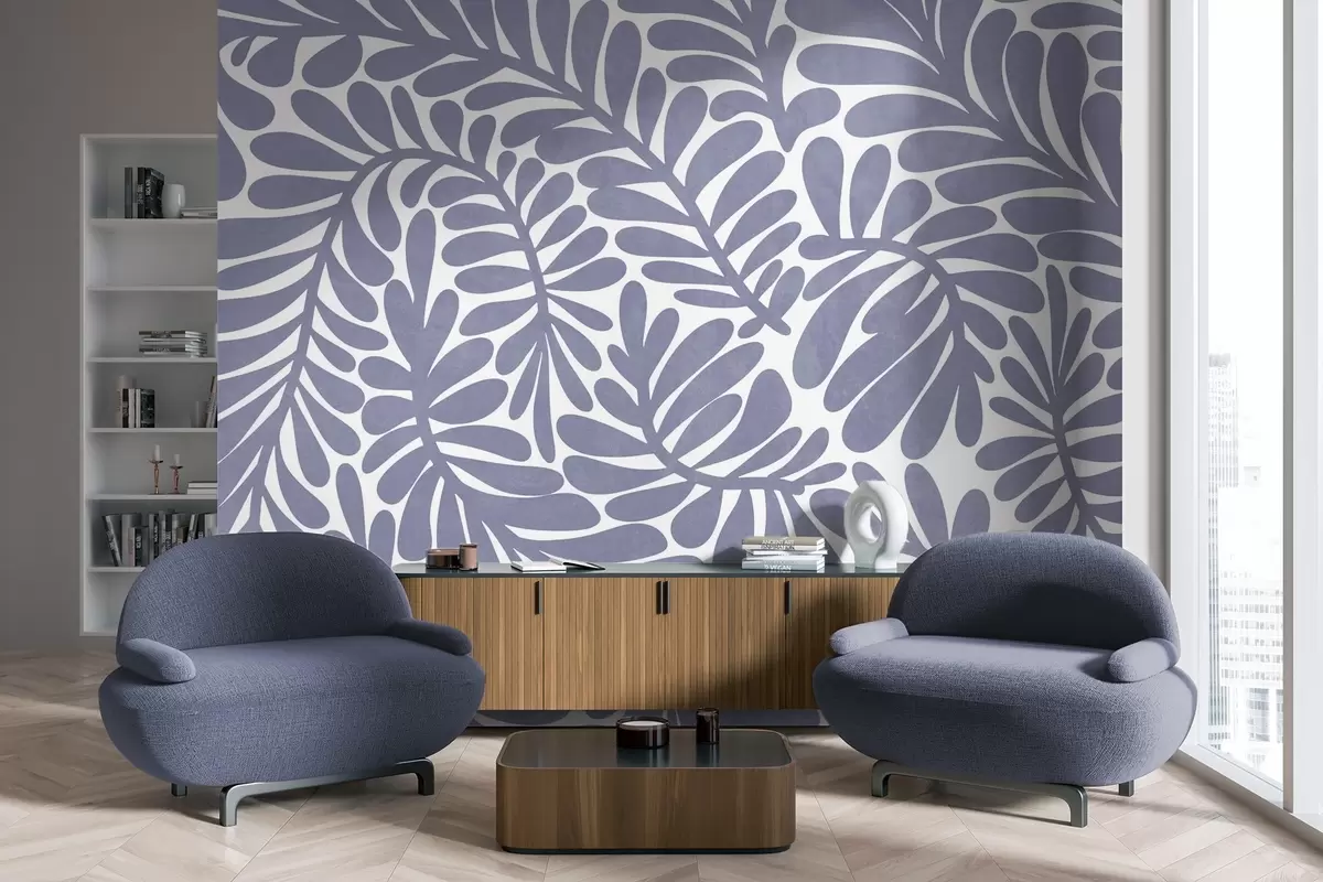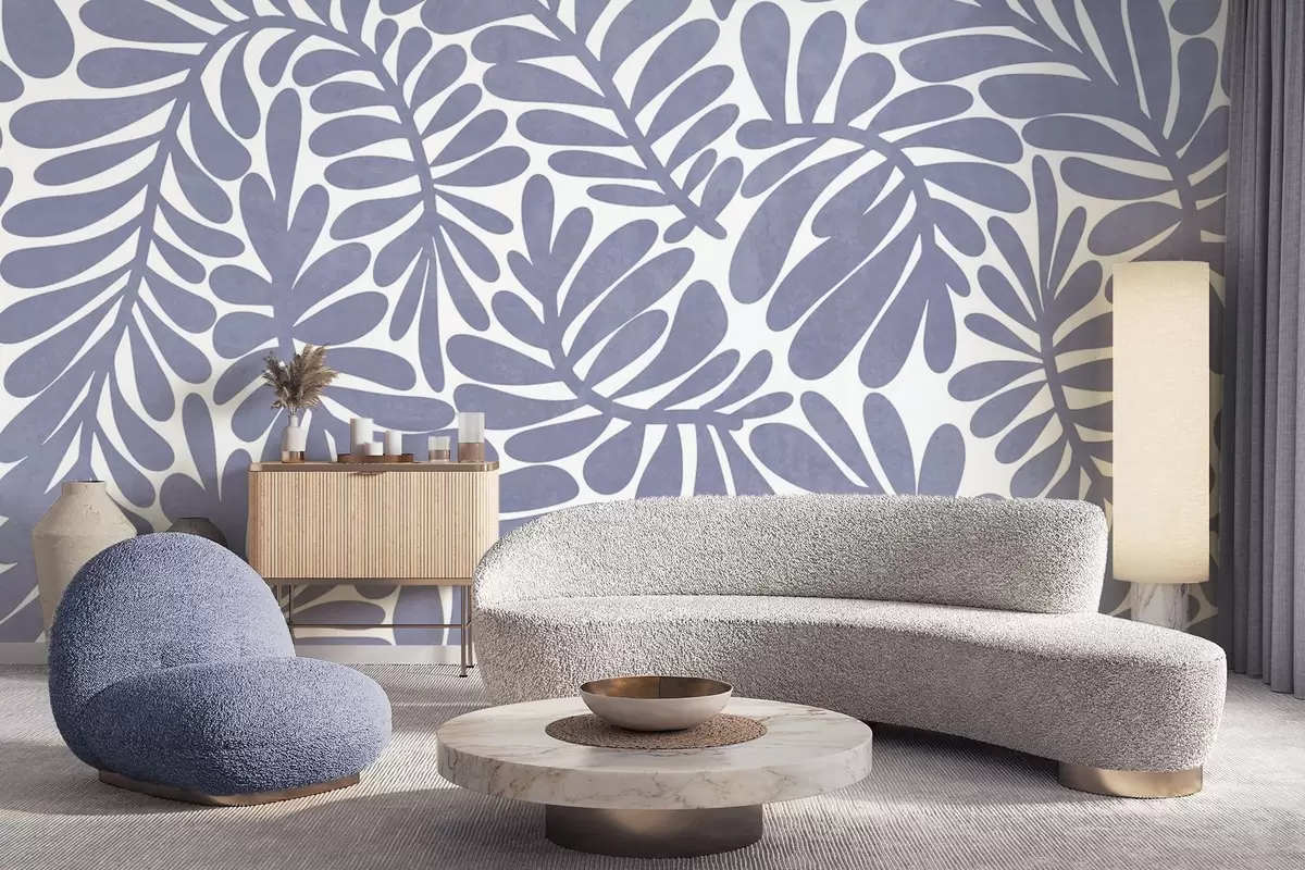 Stenske poslikave Stilizirani svetlo modri listi na svetlem ozadju, teksturirana umetnina Št. w09775v1