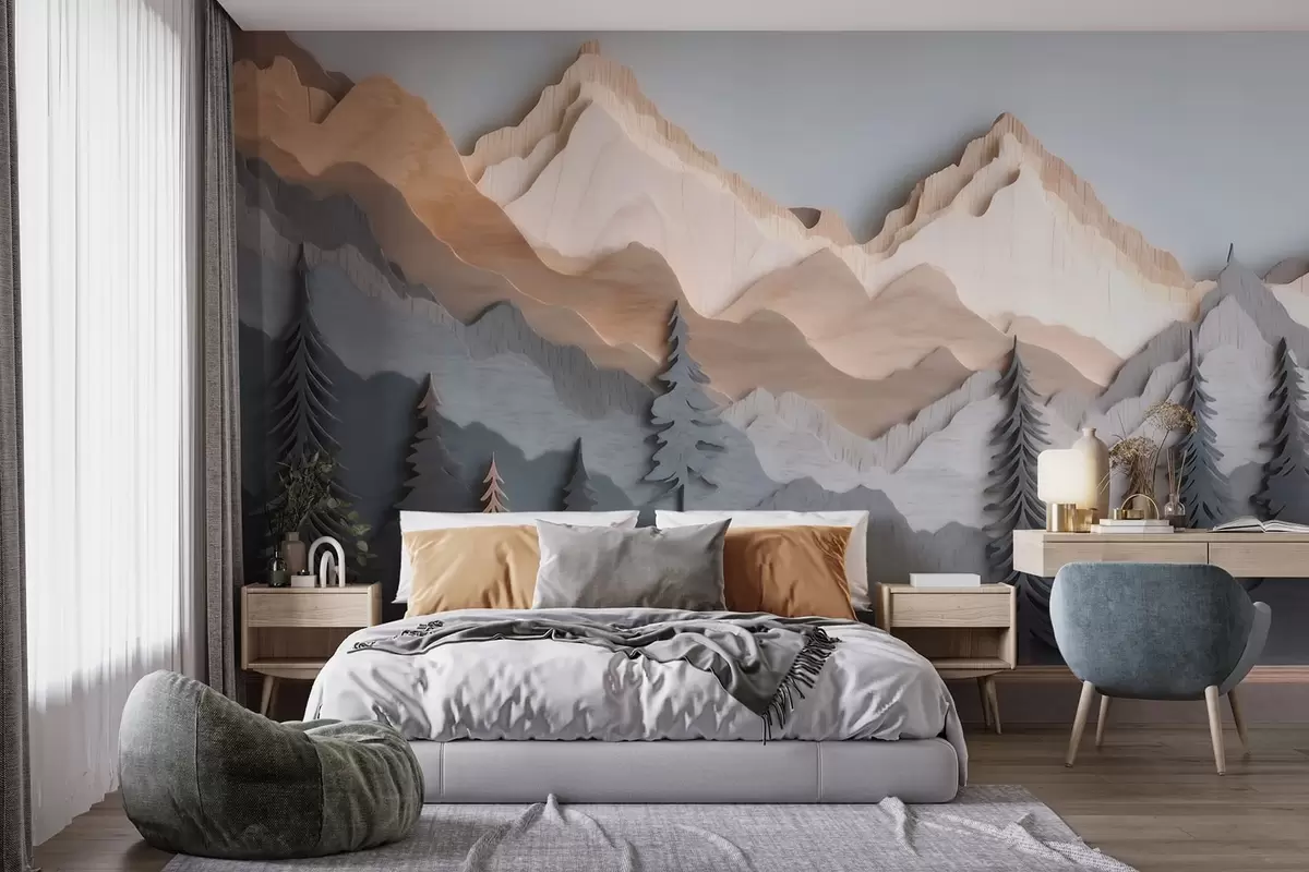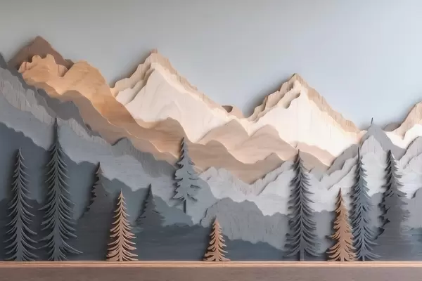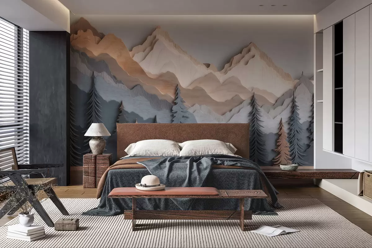 Stenske poslikave Naravna pokrajina z borovci in gorami v slogu rezbarjenega lesa Št. w09793