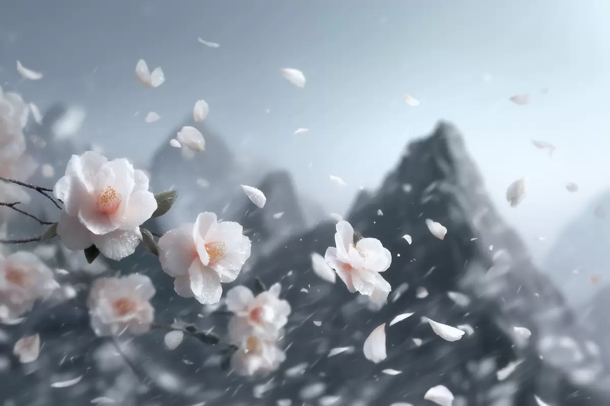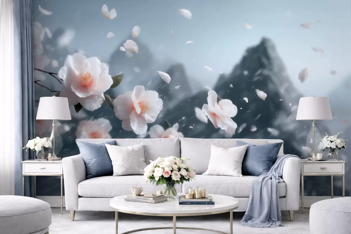 Stenske poslikave Nežni cvetovi češnje na ozadju gora, slikovita japonska pokrajina v pastelnih barvah Št. w09808