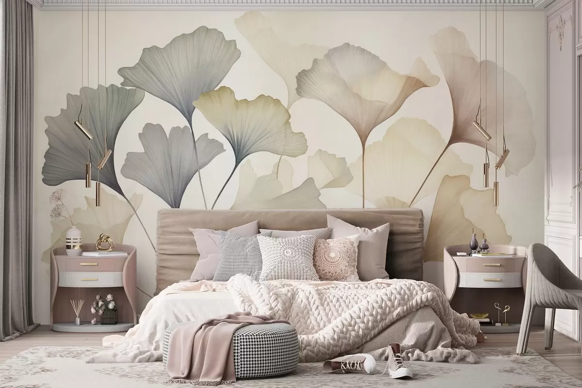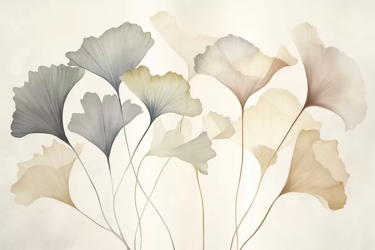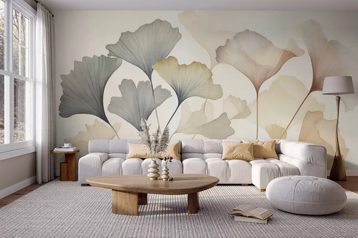 Stenske poslikave Povzetek: listi ginkga v nežnih pastelnih barvah, kot so modra, zelena in breskovo rumena, teksturirana umetnina Št. w09810