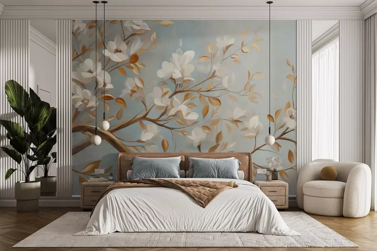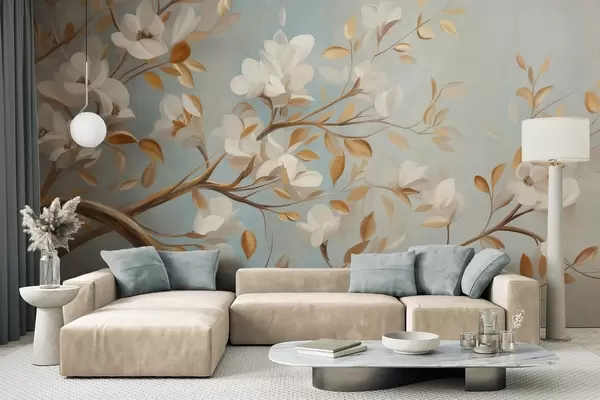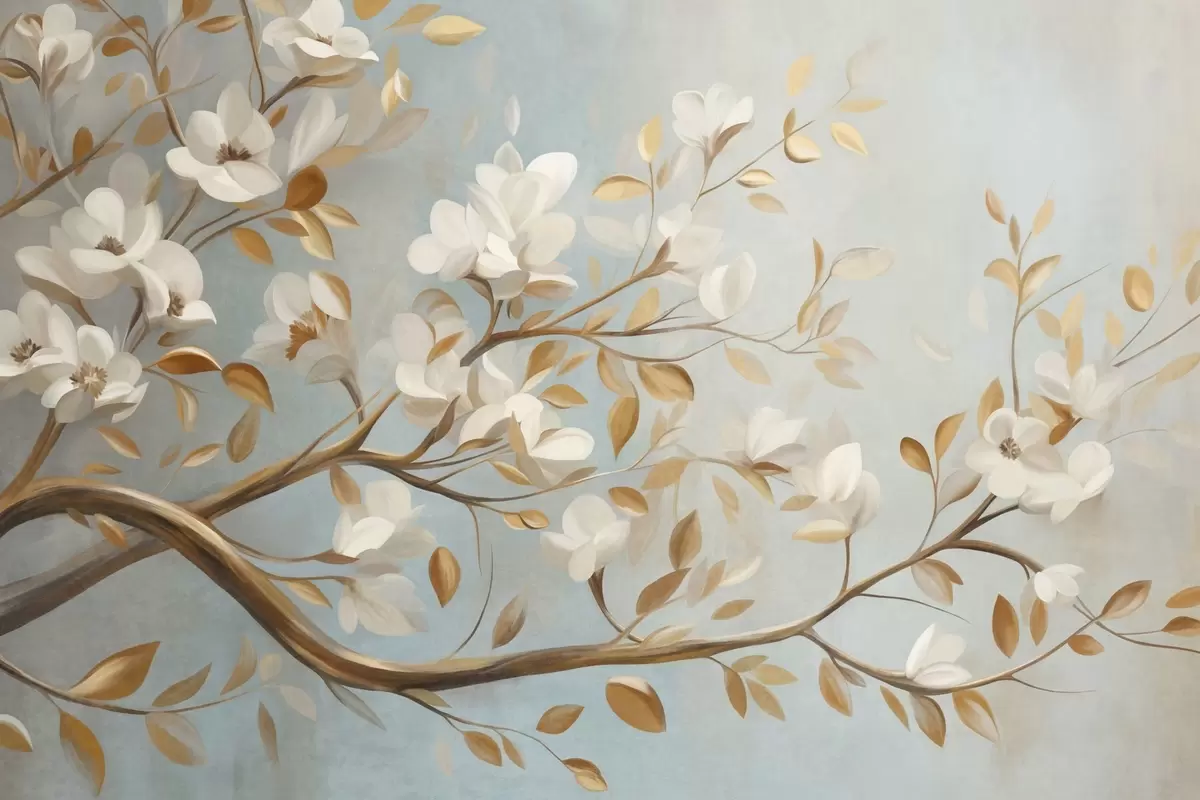 Stenske poslikave Teksturirana veja z belimi cvetovi in rumenimi listi, v vintage slogu Št. w09814