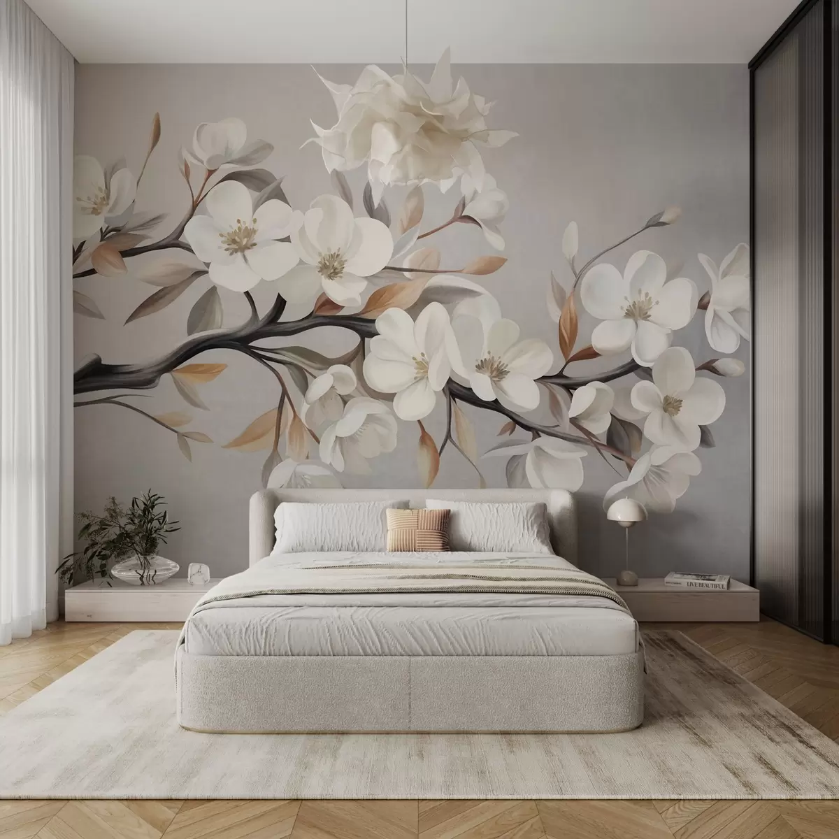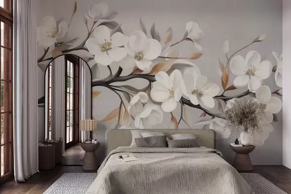 Stenske poslikave Vzorčasta veja z belimi cvetovi in rjavimi listi na svetlo sivem ozadju Št. w09817