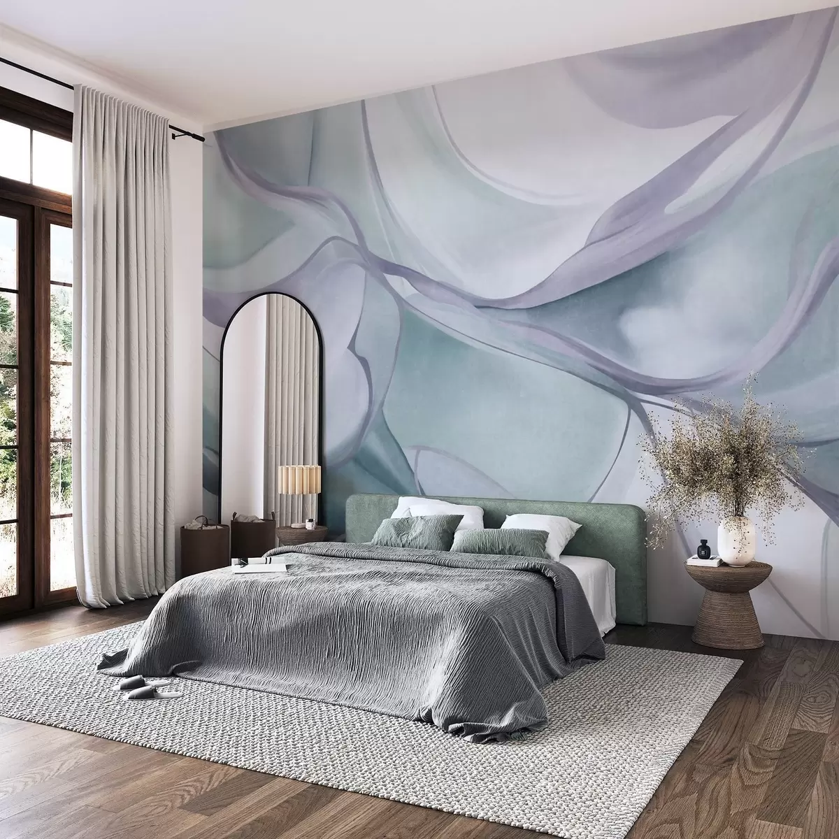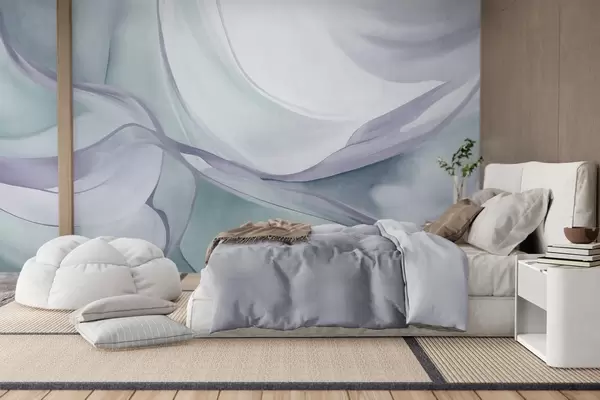 Stenske poslikave Abstraktne, teksturirane, valovite oblike v odtenkih modre in sive barve z nežnimi črtami Št. w09818v1