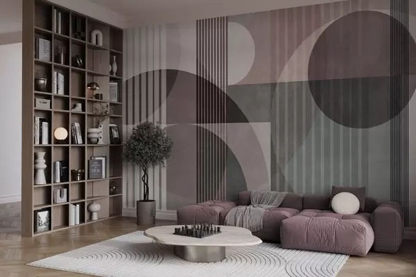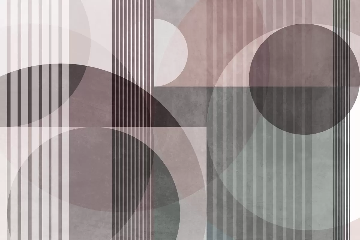 Stenske poslikave Abstraktne geometrijske oblike s krogi in črtami, umirjene barve, teksturirana, večplastna kompozicija Št. w09834v1