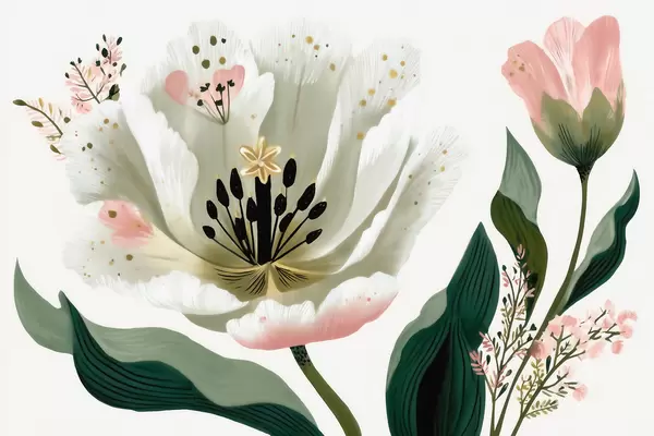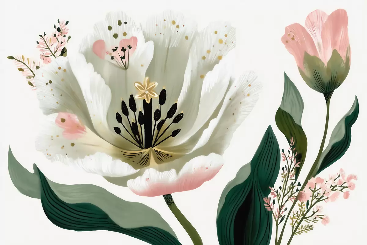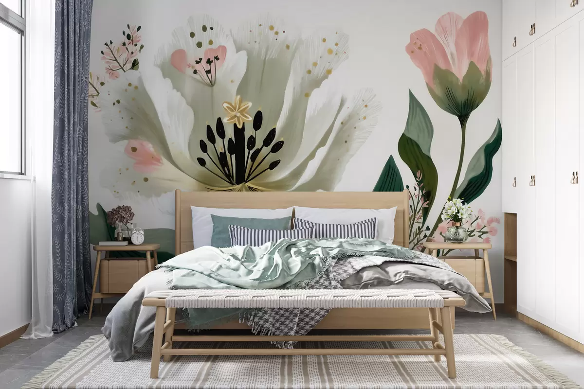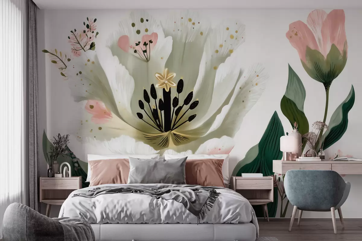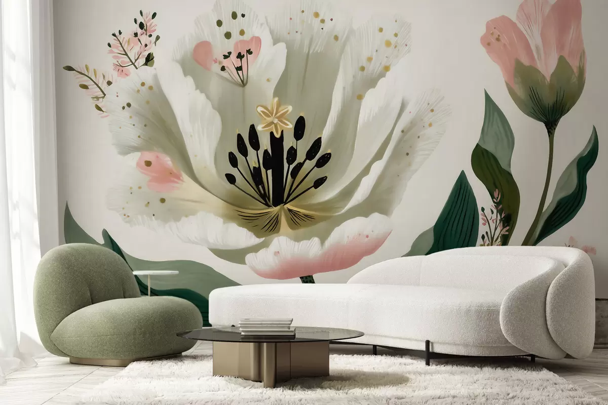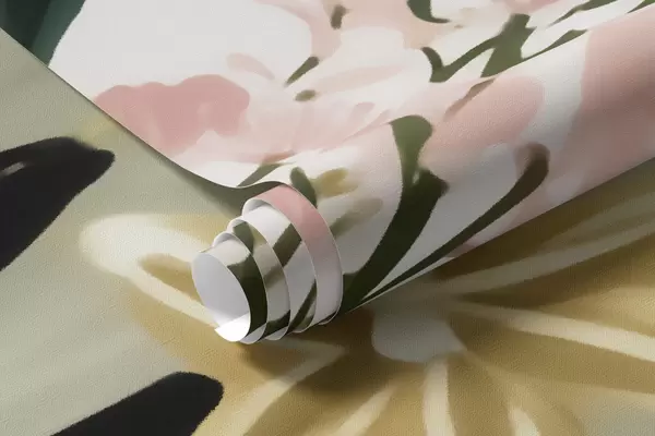 Stenske poslikave Cvet z zelenimi listi in nežnimi rožnatimi poudarki v akvarelnem slogu Št. w09836