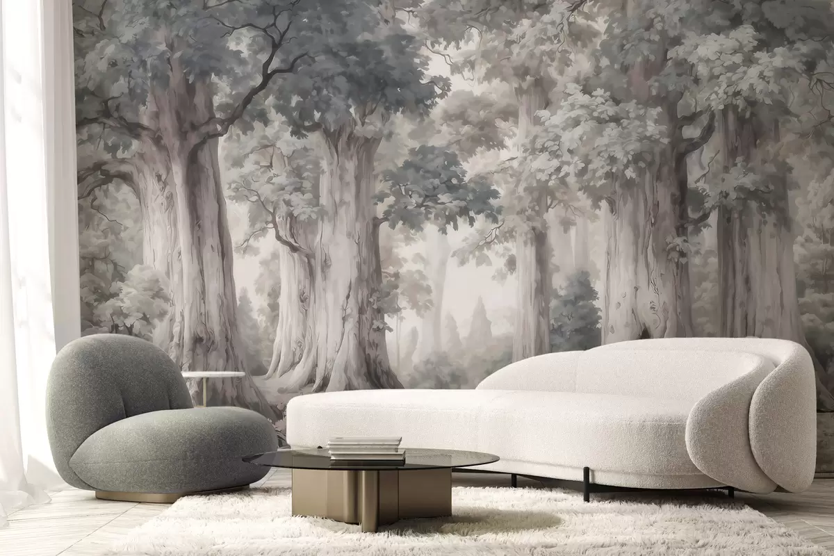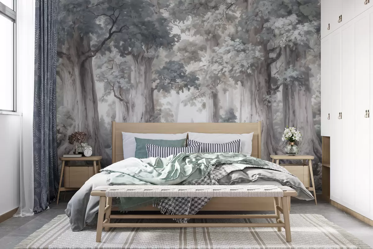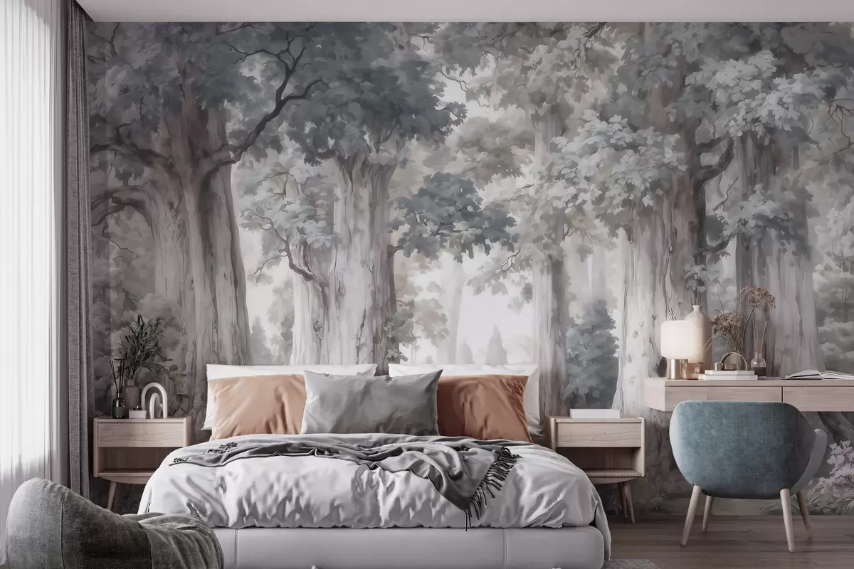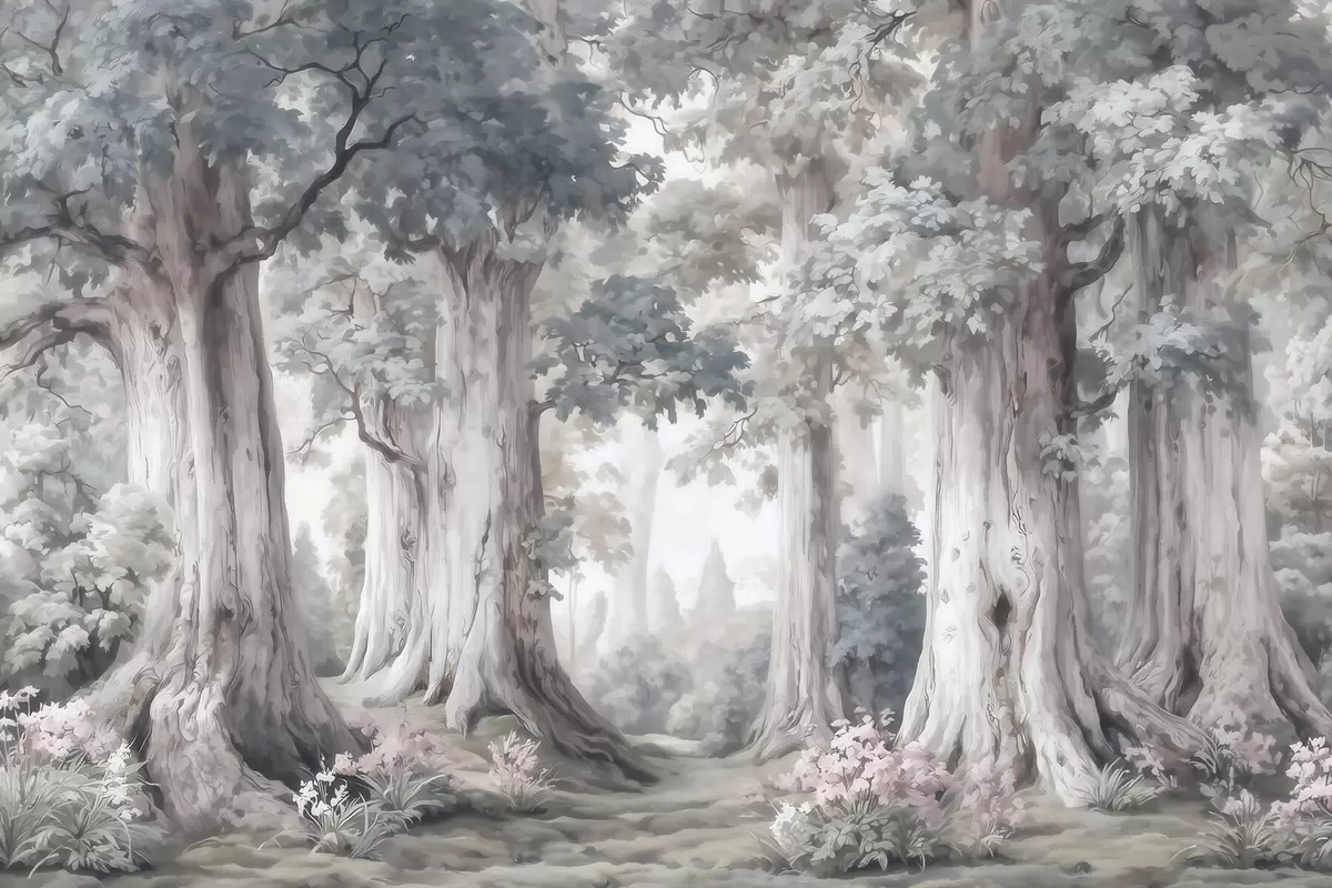 Stenske poslikave Pravljični gozd z visokimi drevesi in nežno, umirjeno barvno paleto v slogu akvarela Št. w09849