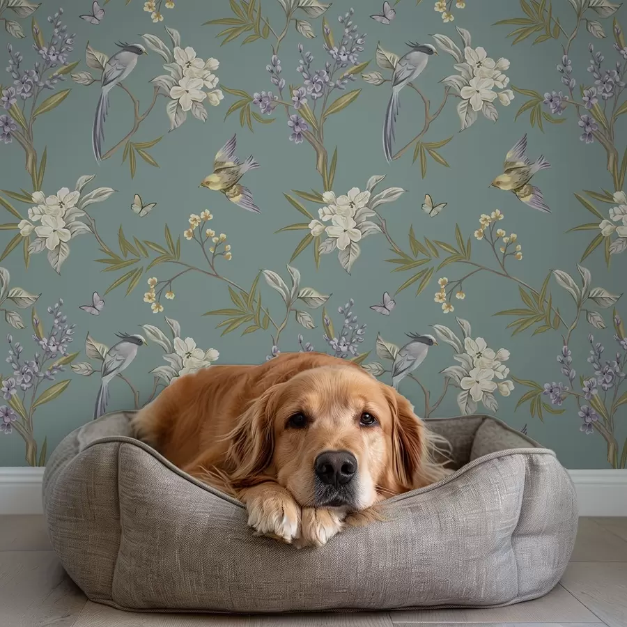 Toile de Jouy z modrimi pticami in tropskimi drevesi