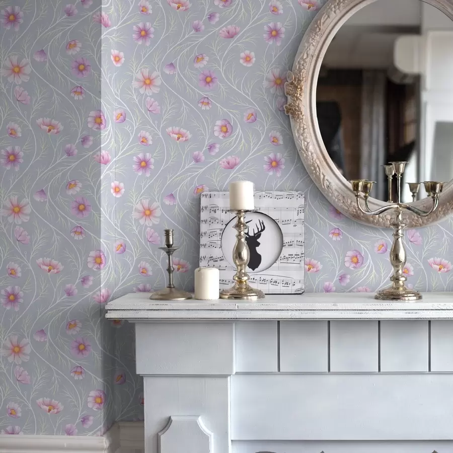 Rožnati kozmos in vitki stebli na sivem ozadju