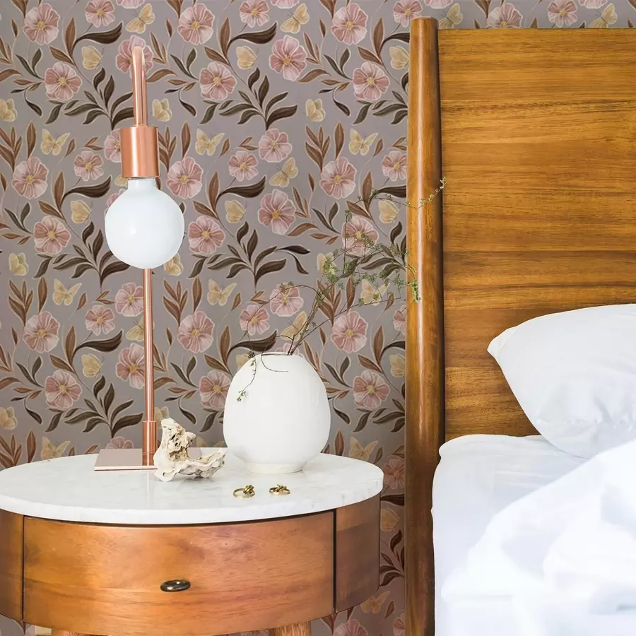 Rožnate cvetlice in metulji na sivo-bežnem ozadju