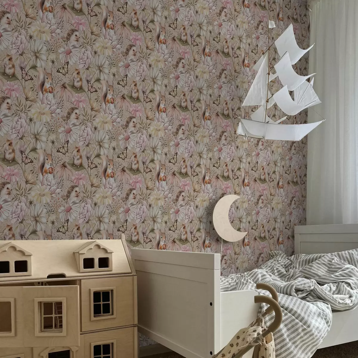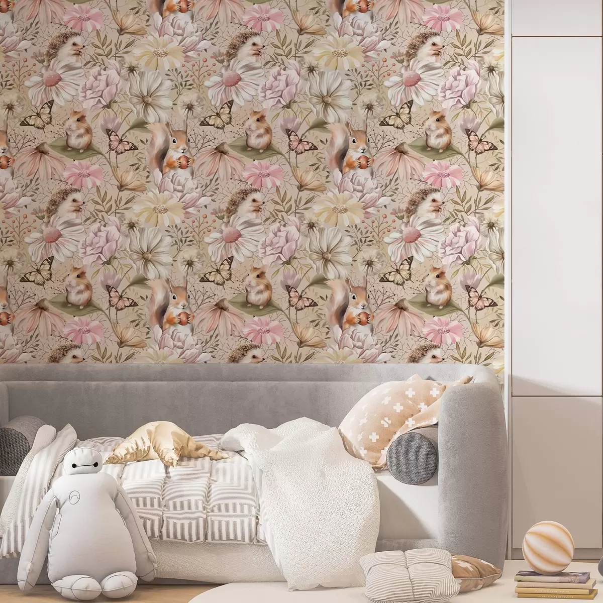 Tapeta Simpatični ježek, veverica, hrček in metulji s cvetjem v pastelnih barvah Št. a00051