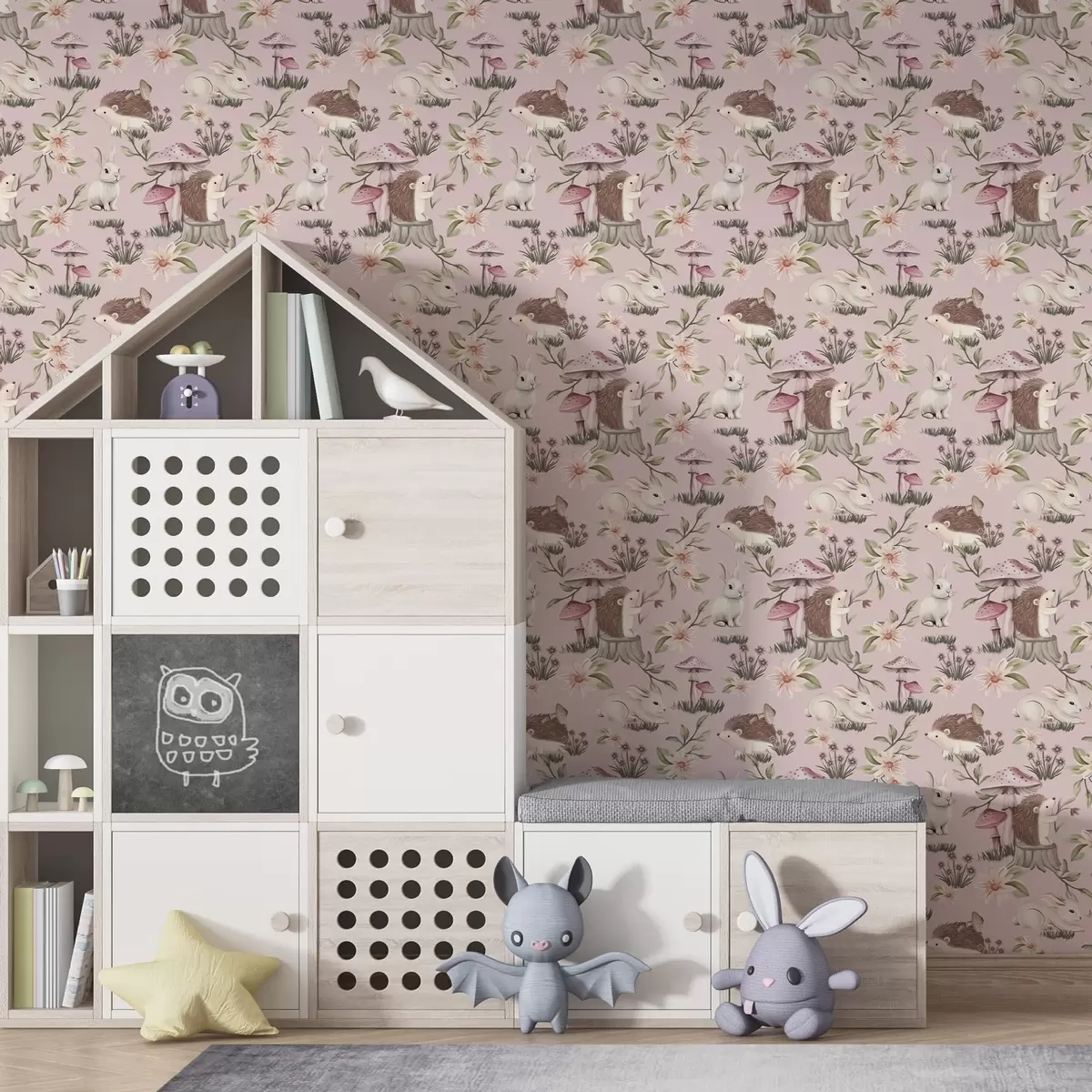Tapeta Ježi, zajci in rože v pravljičnem slogu med gobami na rožnatem ozadju Št. a00111