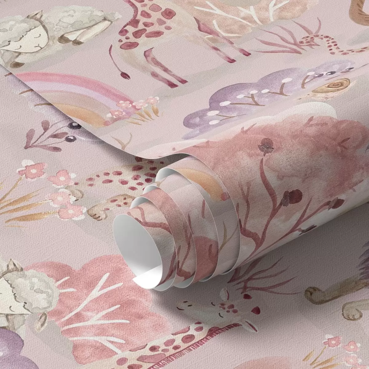 Tapeta Levčki, žirafe in mavrice v pastelnem gozdu Št. a00112