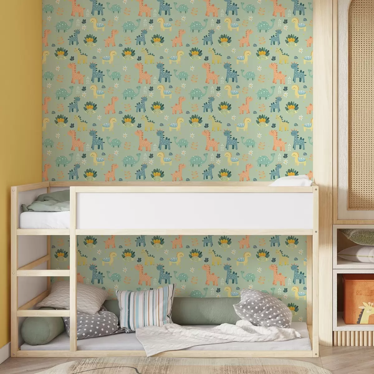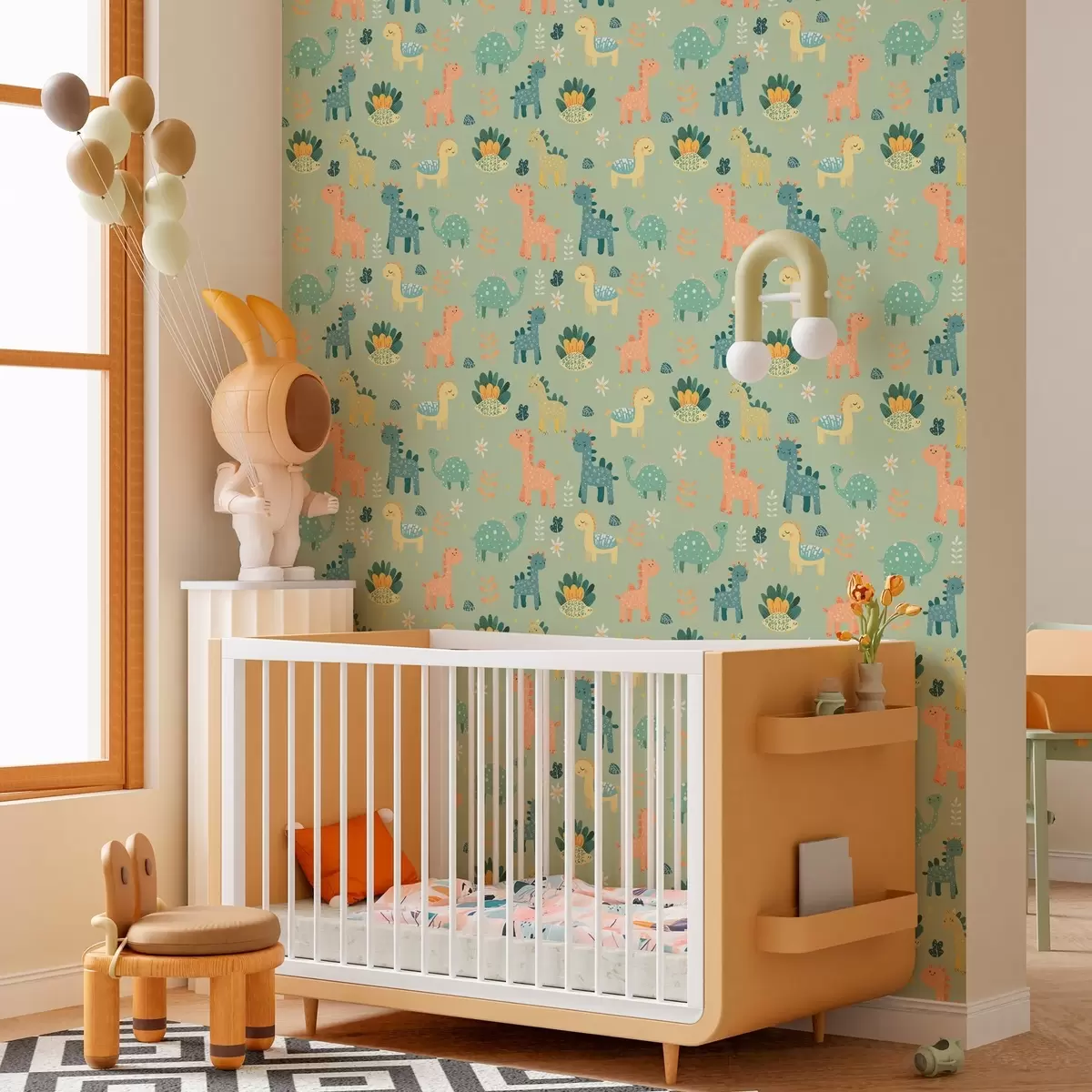 Tapeta Smešni dinozavri v mehki zeleni paleti na svetlem ozadju Št. a00125v1