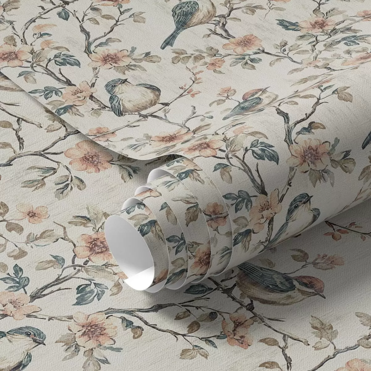 Tapeta Ptice na vejah s cvetjem v retro akvarelnem slogu Št. a00197