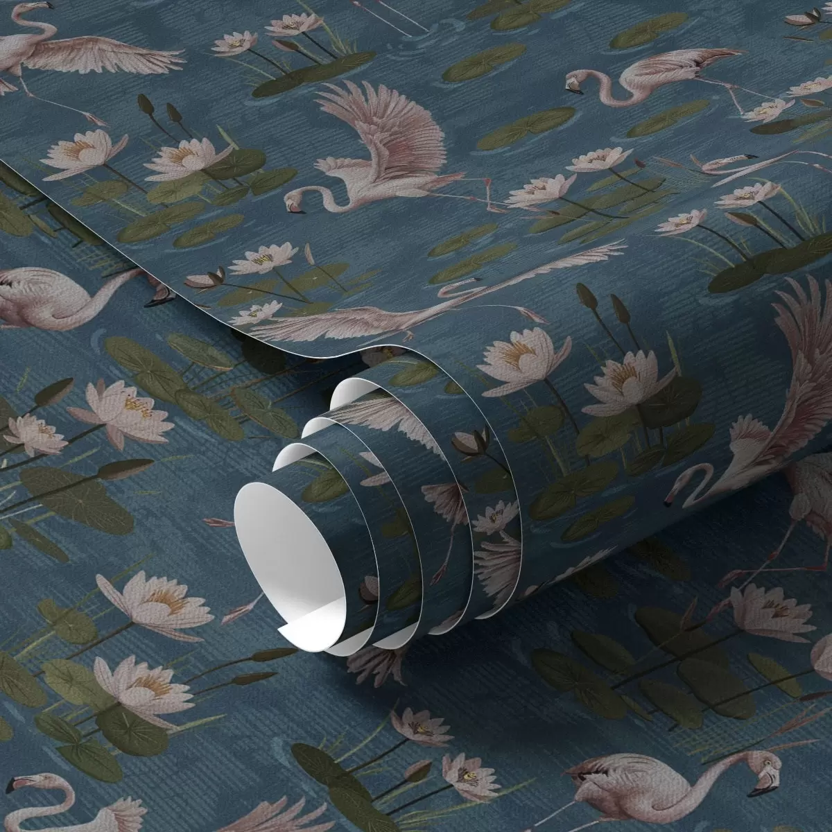 Tapeta Flamingo med vodnimi lilijami, tropski prizor na mornarsko modrem ozadju Št. a00237