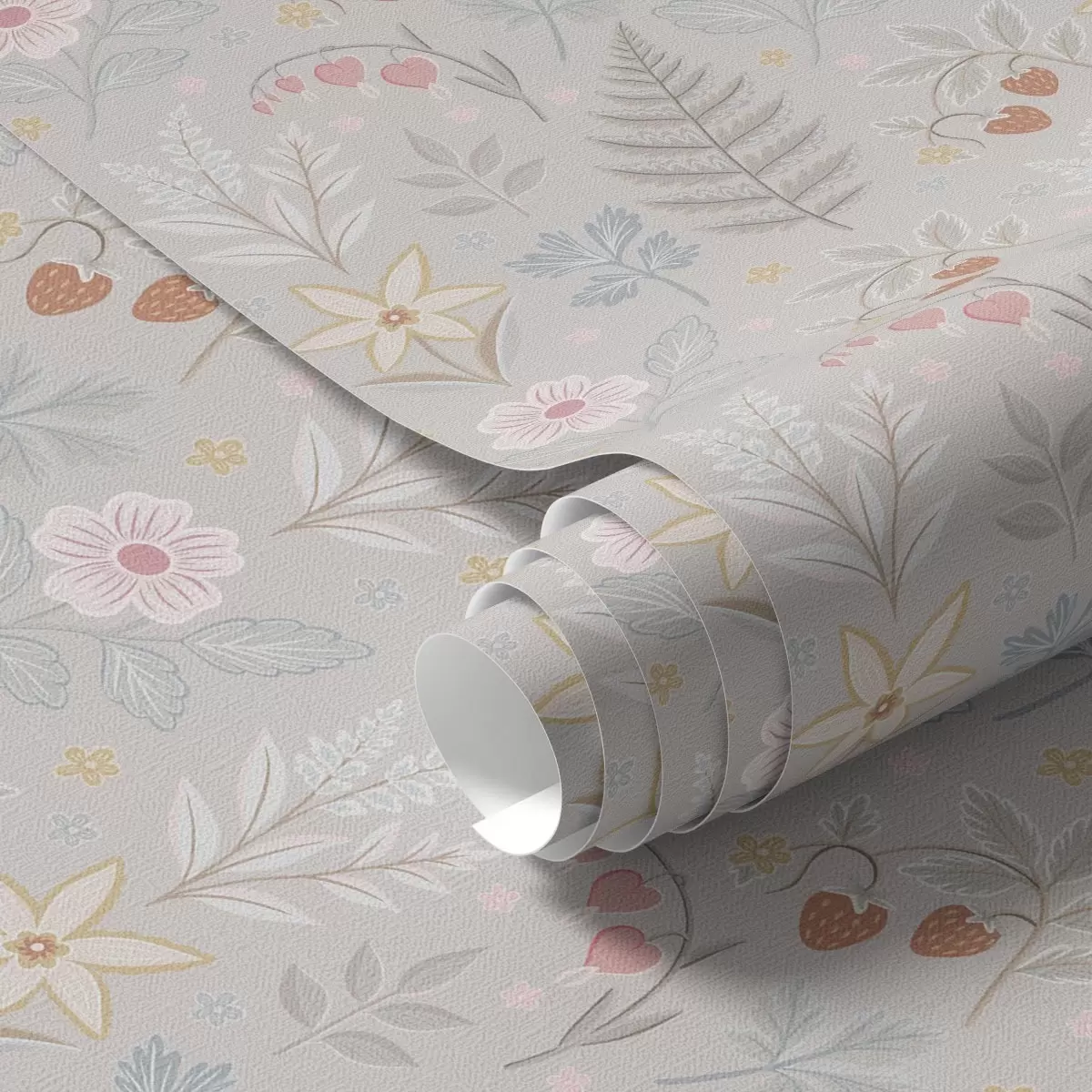 Tapeta Pastelno cvetje in jagode na svetlo sivem ozadju Št. a00406