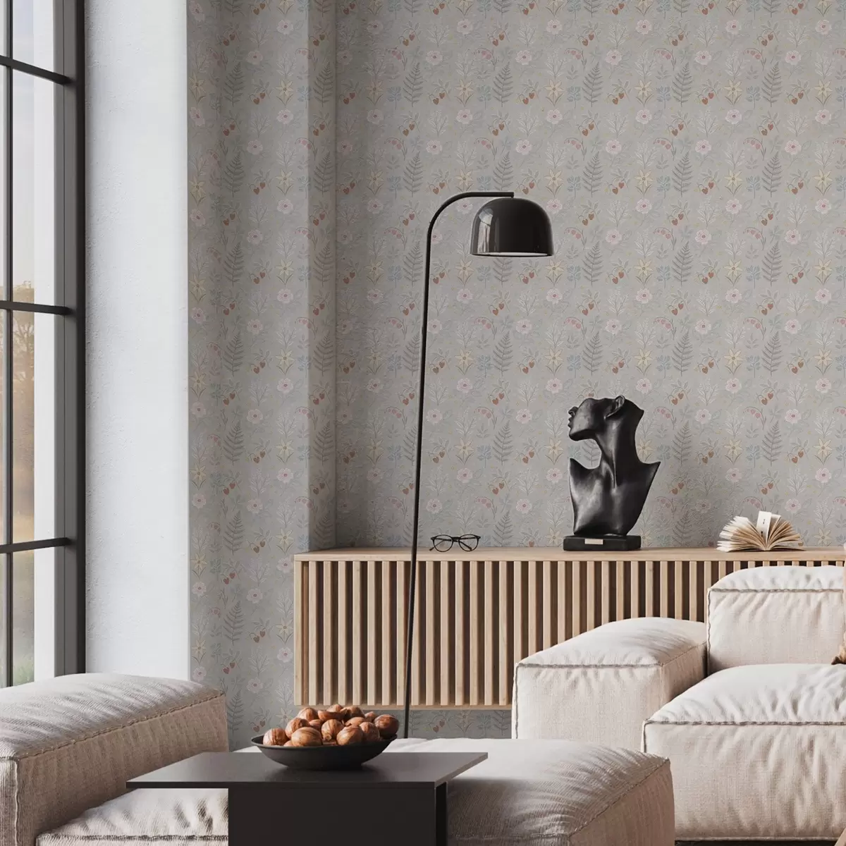 Tapeta Pastelno cvetje in jagode na svetlo sivem ozadju Št. a00406
