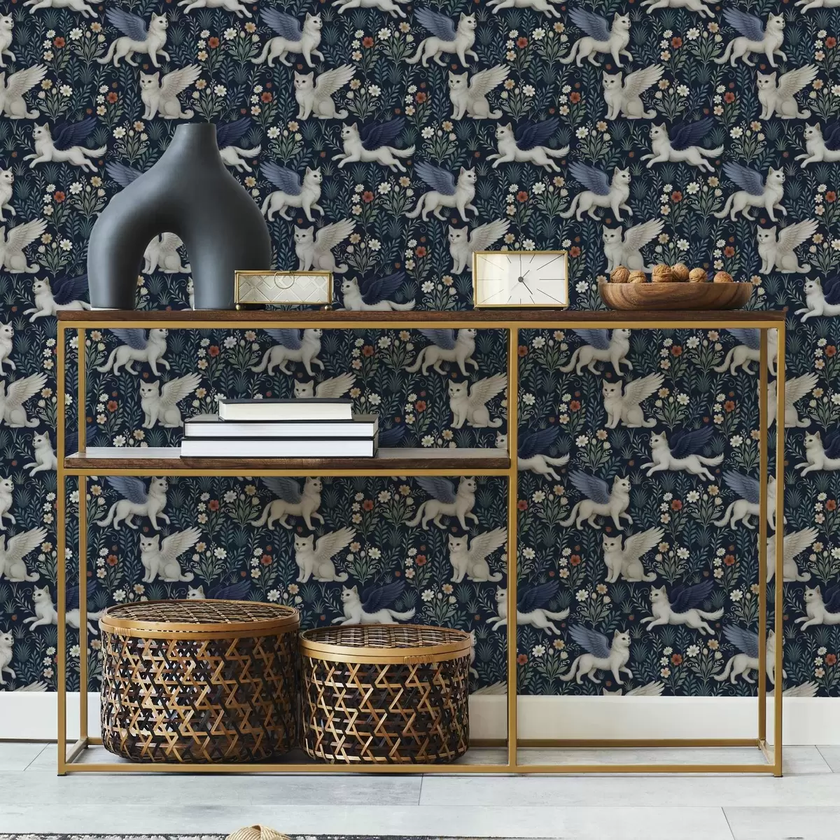 Tapeta Fantastične mačke s krili med rožami Št. a00408