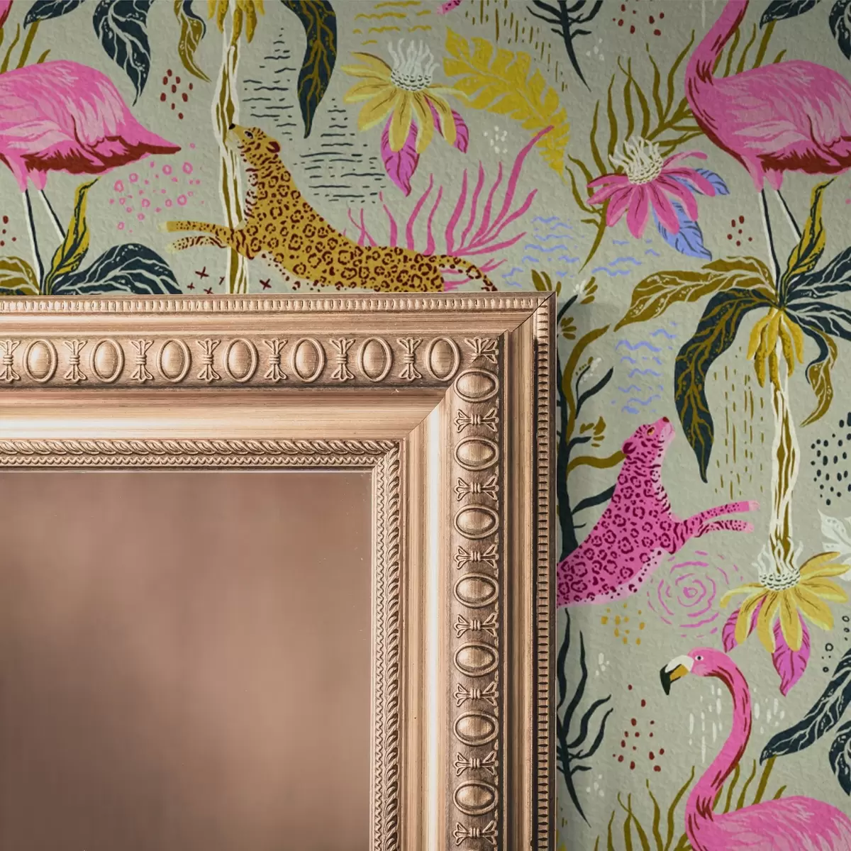 Tapeta Svetli flamingi in leopardi med tropskimi rastlinami Št. a00470