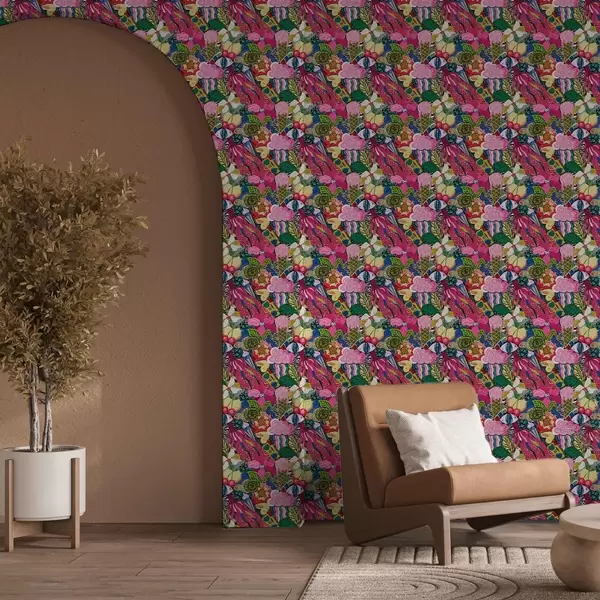 Tapeta Abstraktni pop-art s cvetjem, jagodami in vzorci Št. a00471