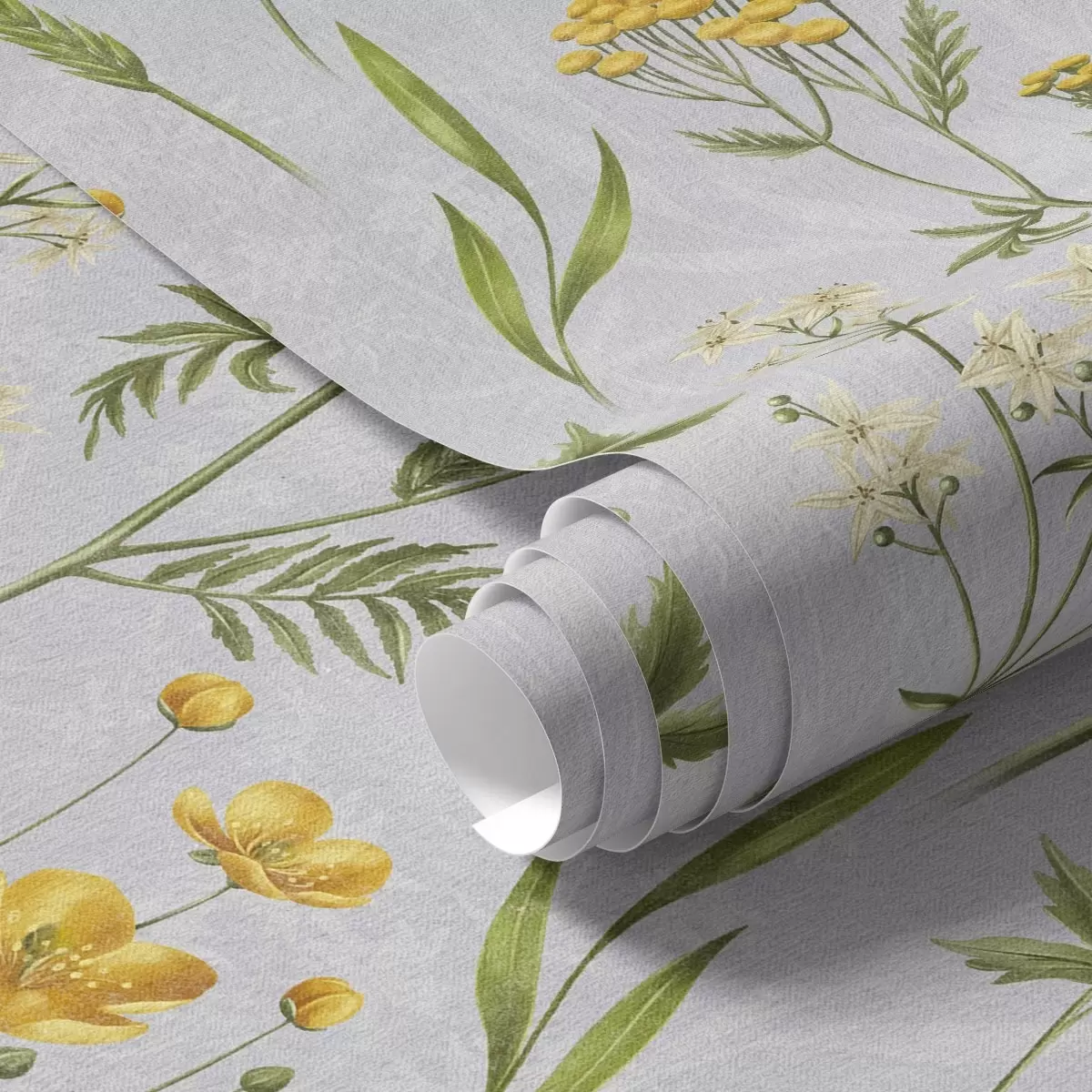 Tapeta Rumeno cvetje in zelenje na svetlo sivem ozadju Št. a00472