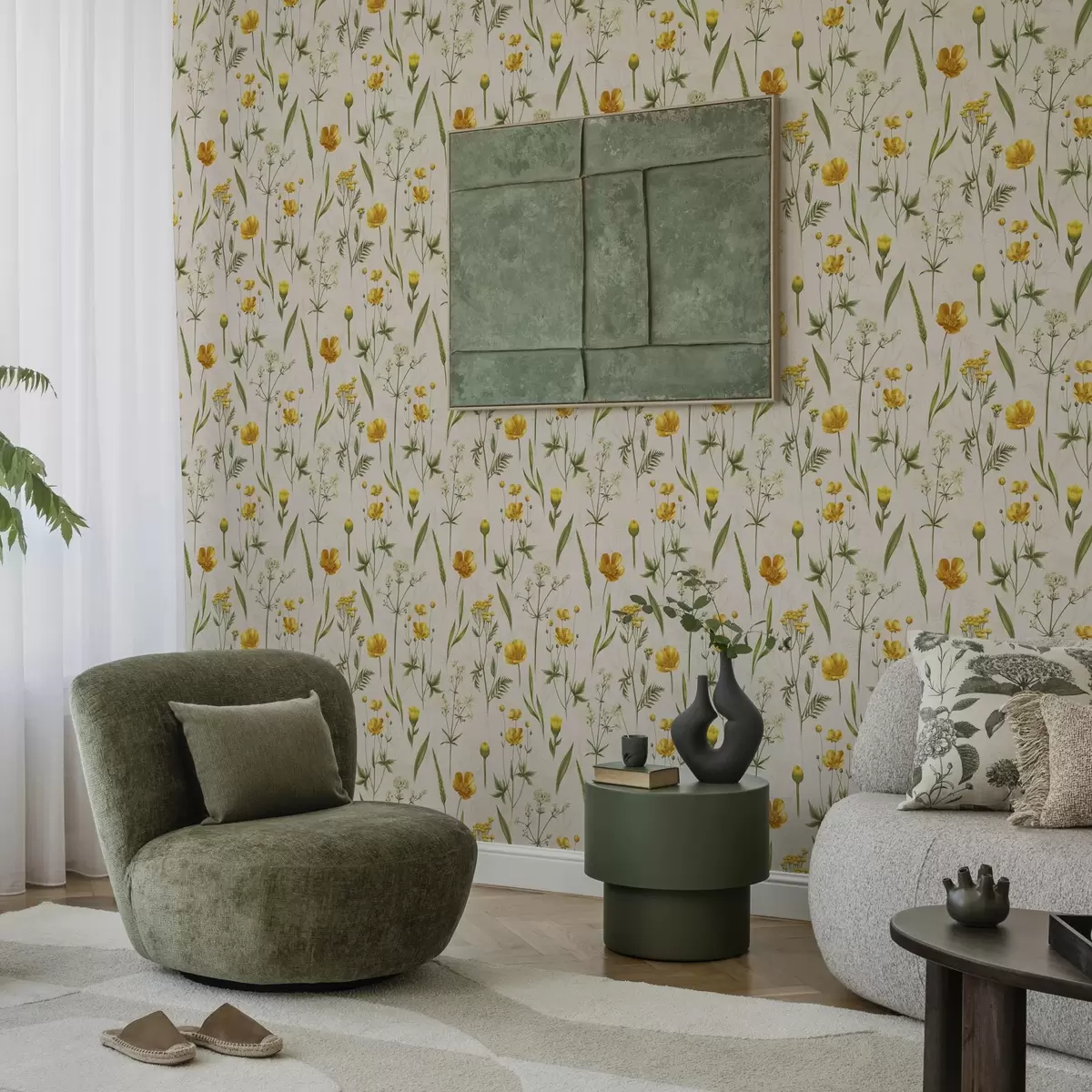 Tapeta Rumeno cvetje in zelenje na bež ozadju Št. a00472v2