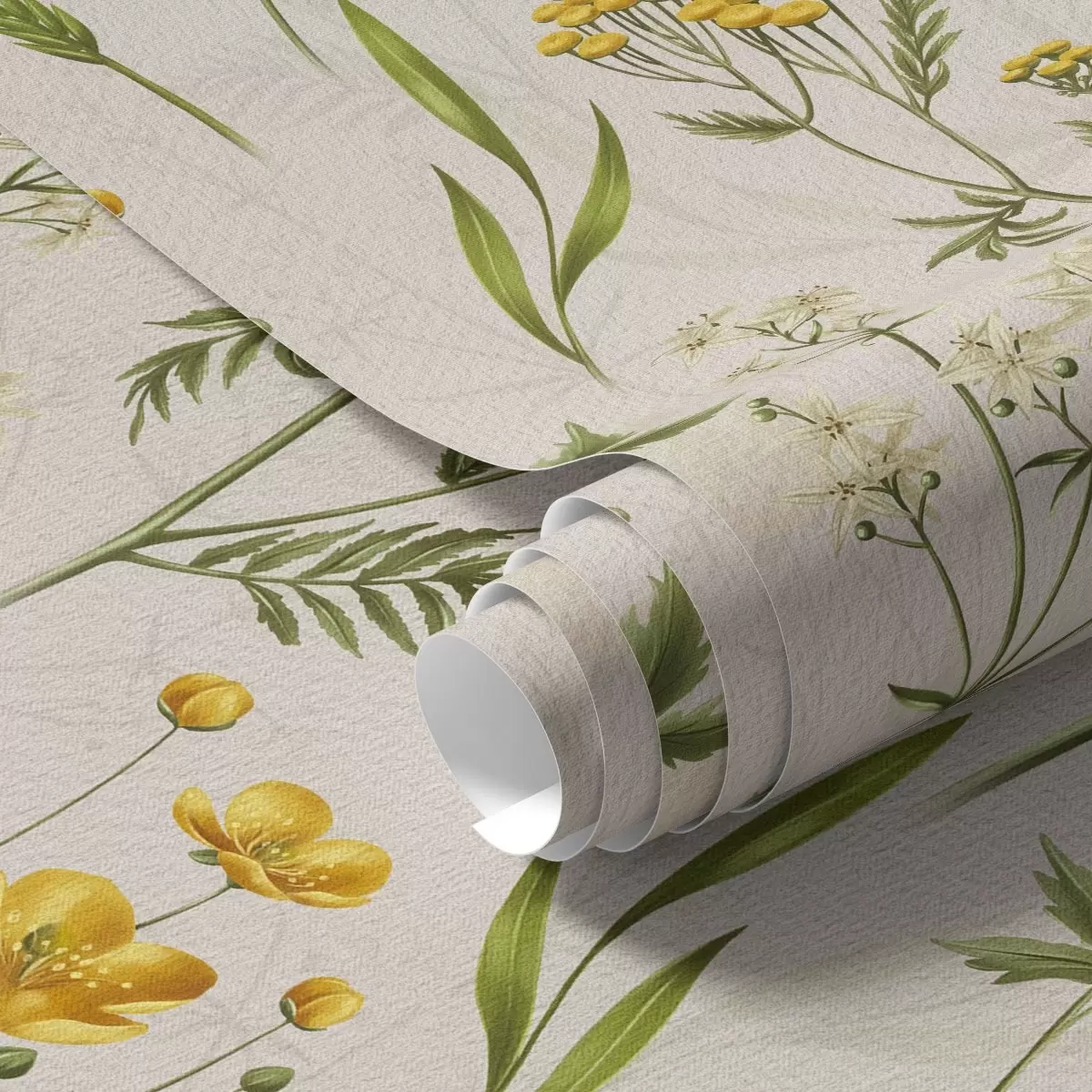 Tapeta Rumeno cvetje in zelenje na bež ozadju Št. a00472v2