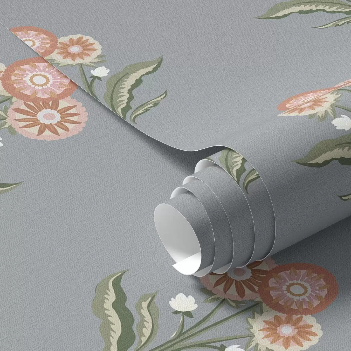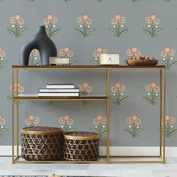 Tapeta Stilizirane cvetlice na sivo-modrem ozadju, topla paleta Št. a00494