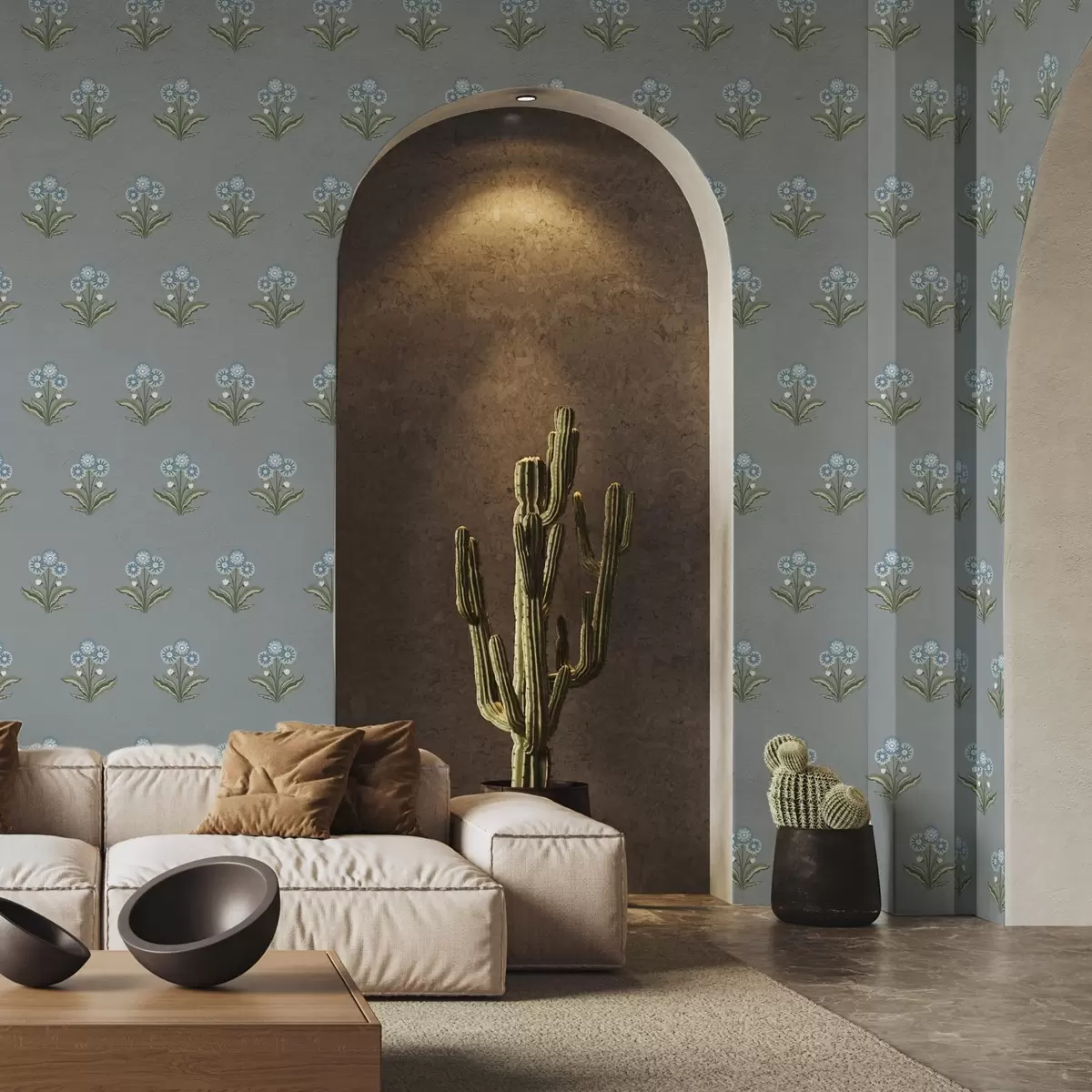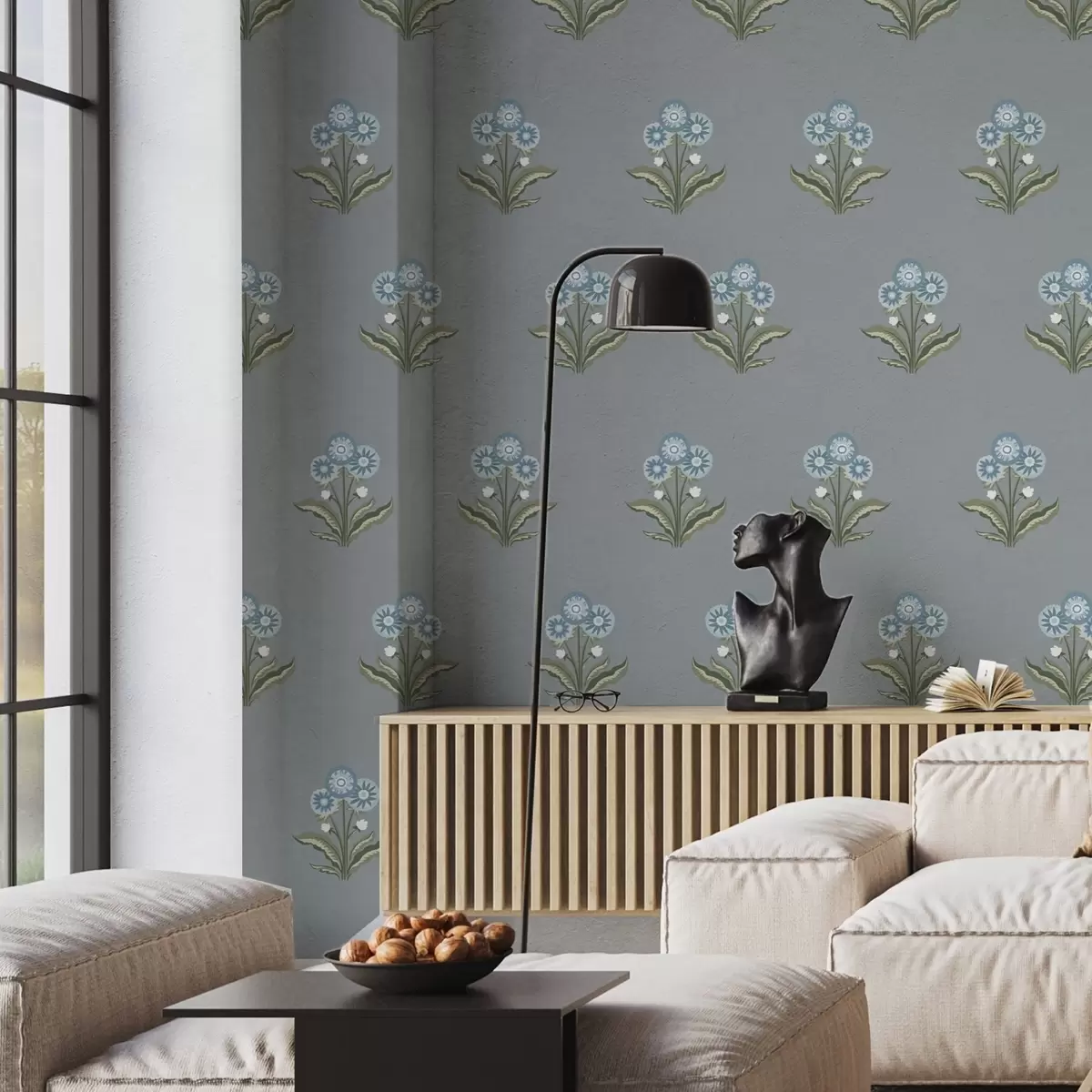 Tapeta Stilizirane cvetlice na sivo-modrem ozadju, hladna paleta Št. a00494v1