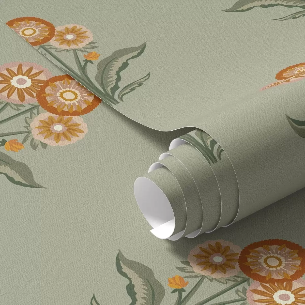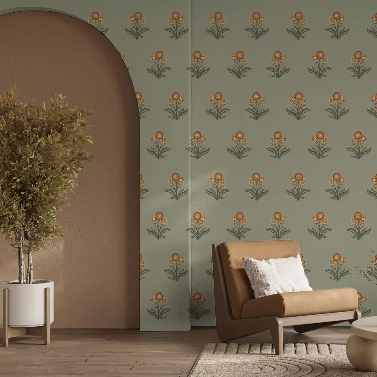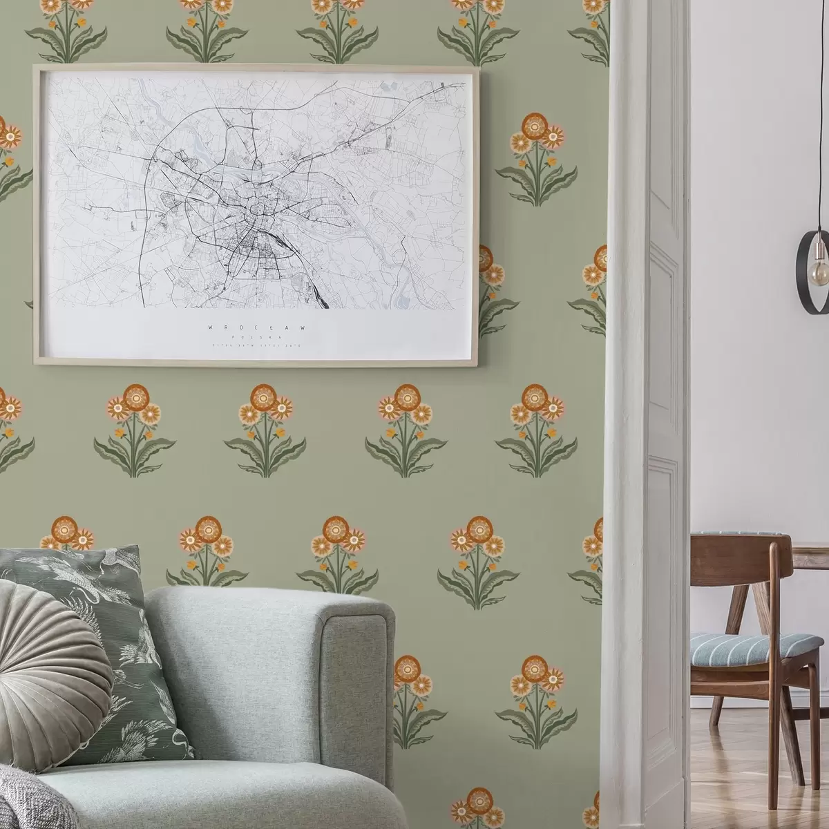 Tapeta Stilizirane cvetlice na olivnem ozadju, topli toni Št. a00494v2