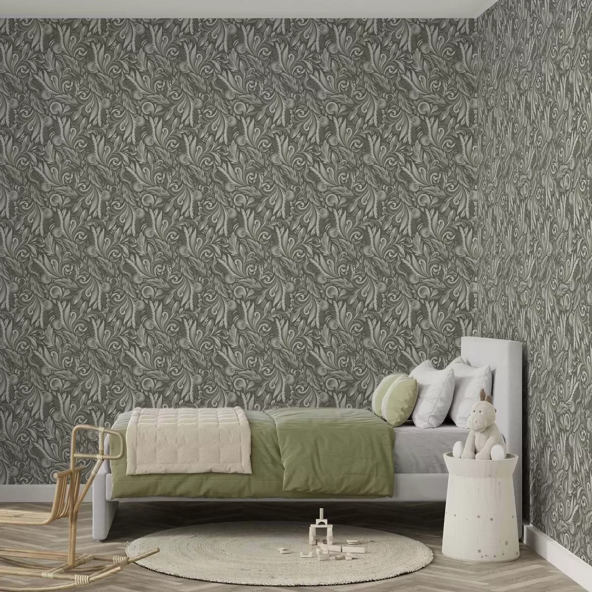 Tapeta Akantove volute v olivno-bež barvni paleti Št. a00501