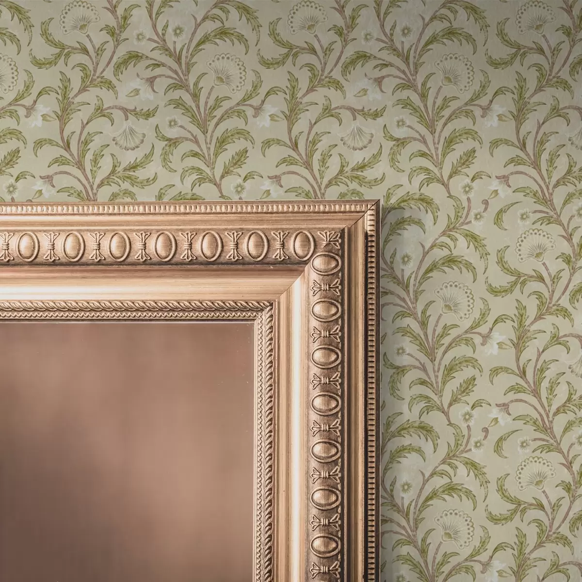 Tapeta Vintage okras z volutami in cvetovi, bež in olivno zelen Št. a00574