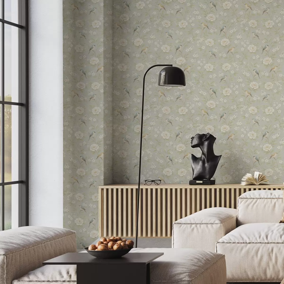 Tapeta Ptice med belimi cvetovi na sivo-zelenem ozadju Št. a00583