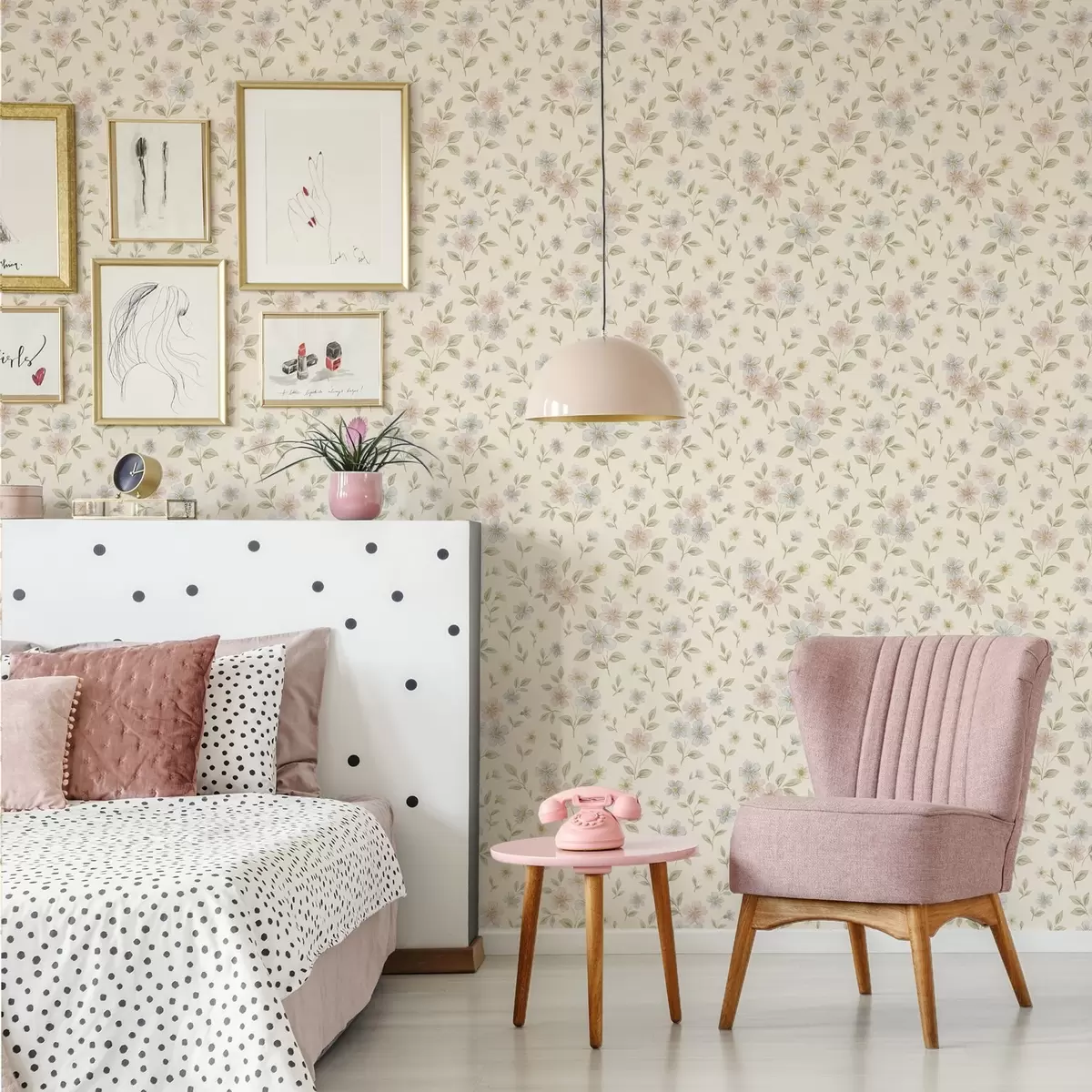 Tapeta Pastelne travniške rože na kremastem ozadju Št. a00596