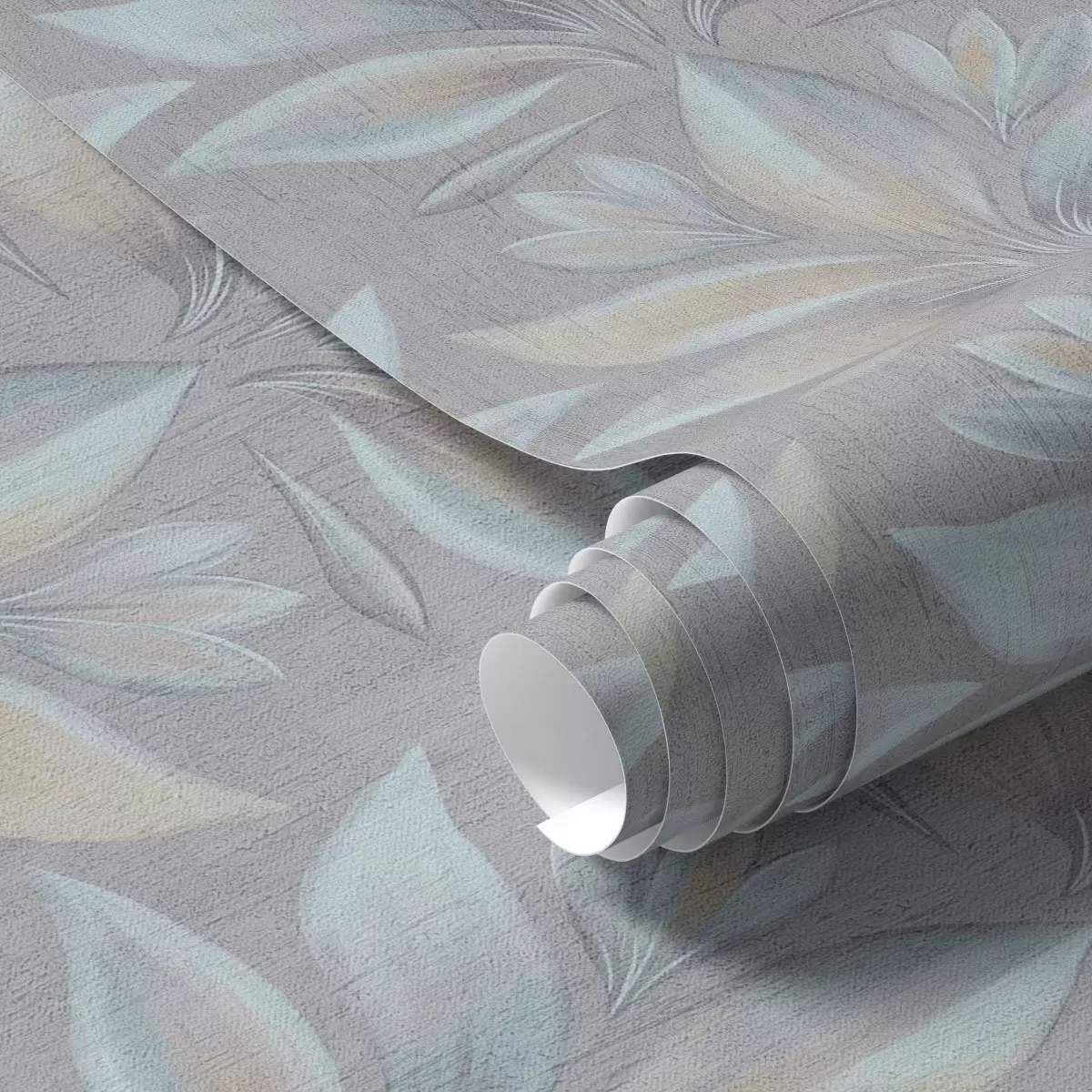 Tapeta Veliki stilizirani listi v modro-peščeni barvni paleti na sivi podlagi Št. a00601