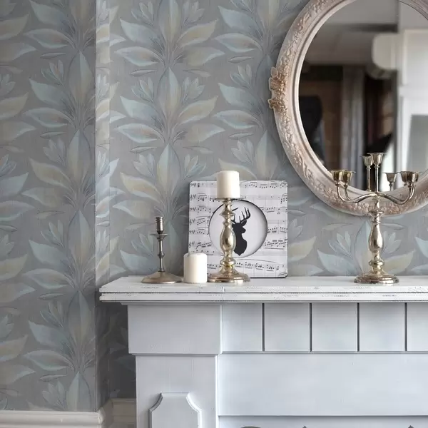 Tapeta Veliki stilizirani listi v modro-peščeni barvni paleti na sivi podlagi Št. a00601