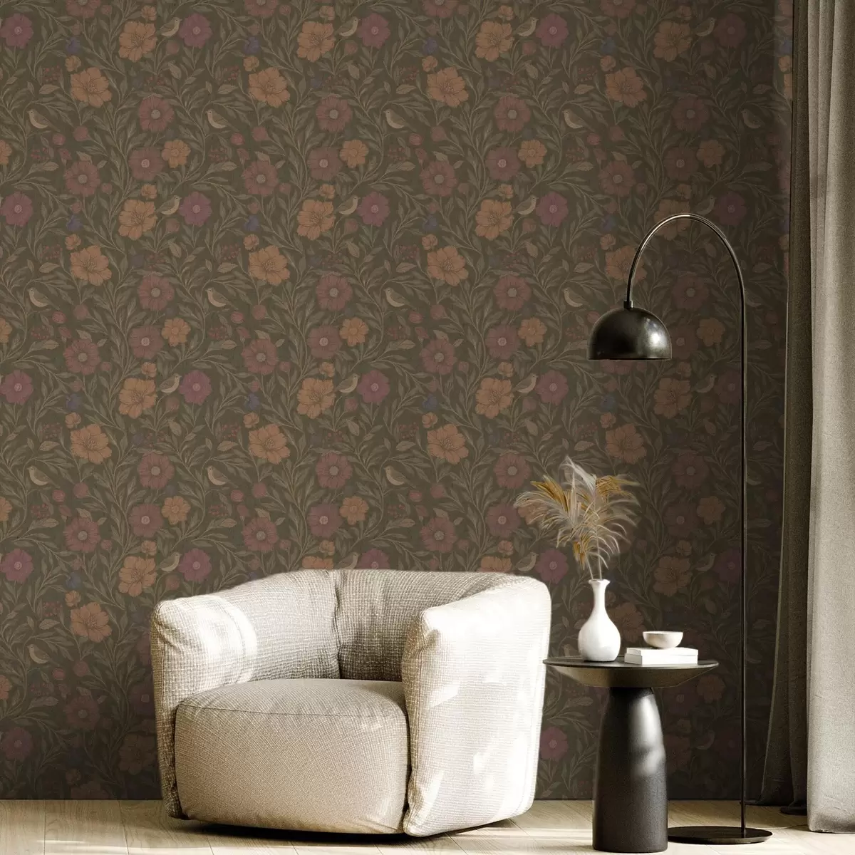 Tapeta Jesenske rože in ptice na olivno rjavem ozadju Št. a00605