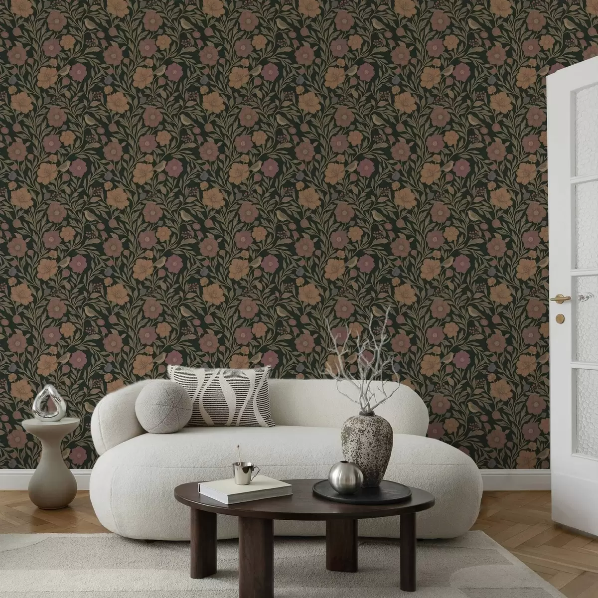 Tapeta Jesenske rože in ptice na temno smaragdnem ozadju Št. a00605v1