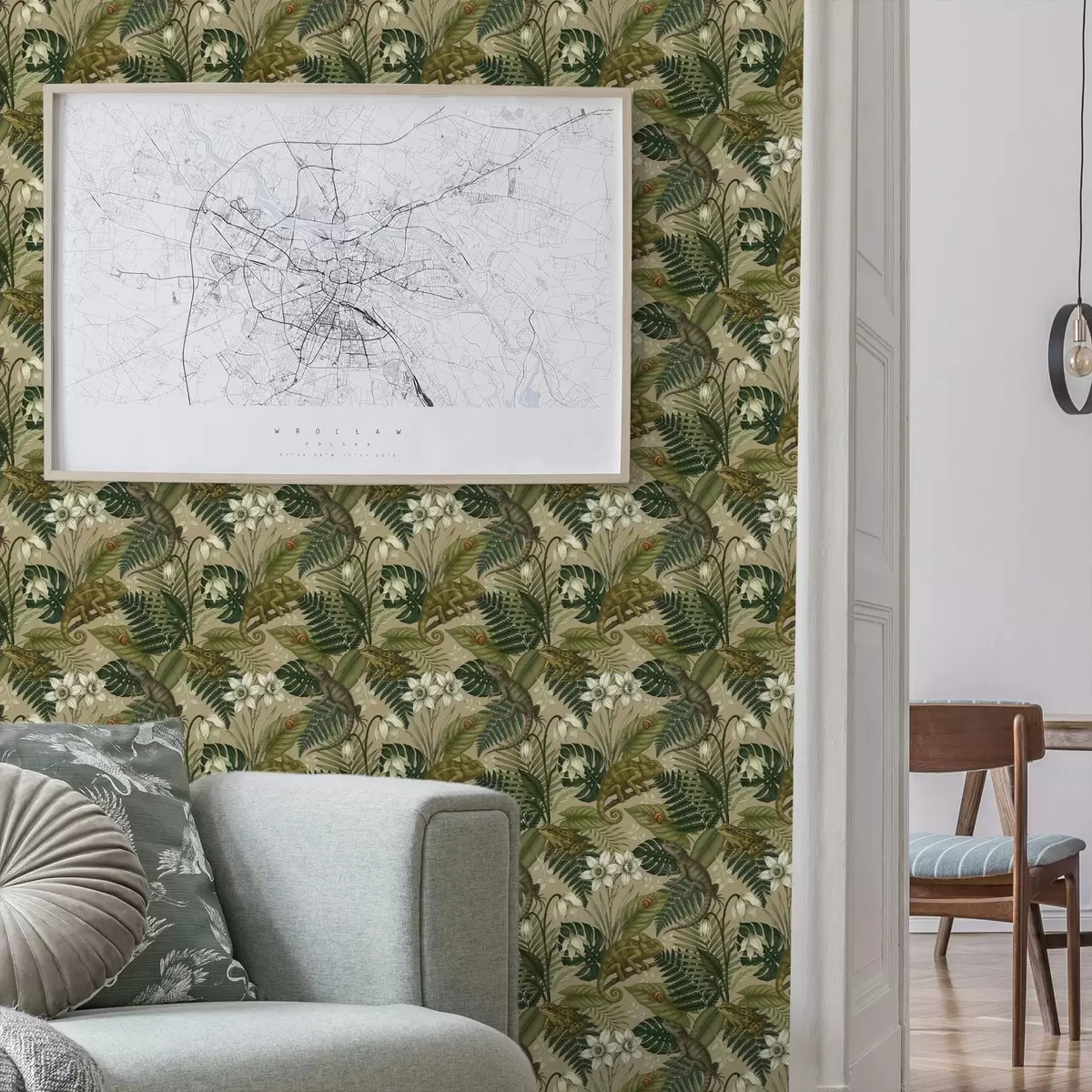 Tapeta Kameleoni in tropska listja, beli cvetovi, bež podlaga Št. a00608